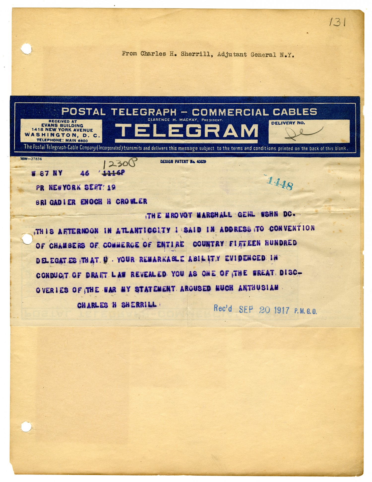 | Title | Telegram to General Enoch Crowder from Charles H. Sherrill - September 17, 1917 |