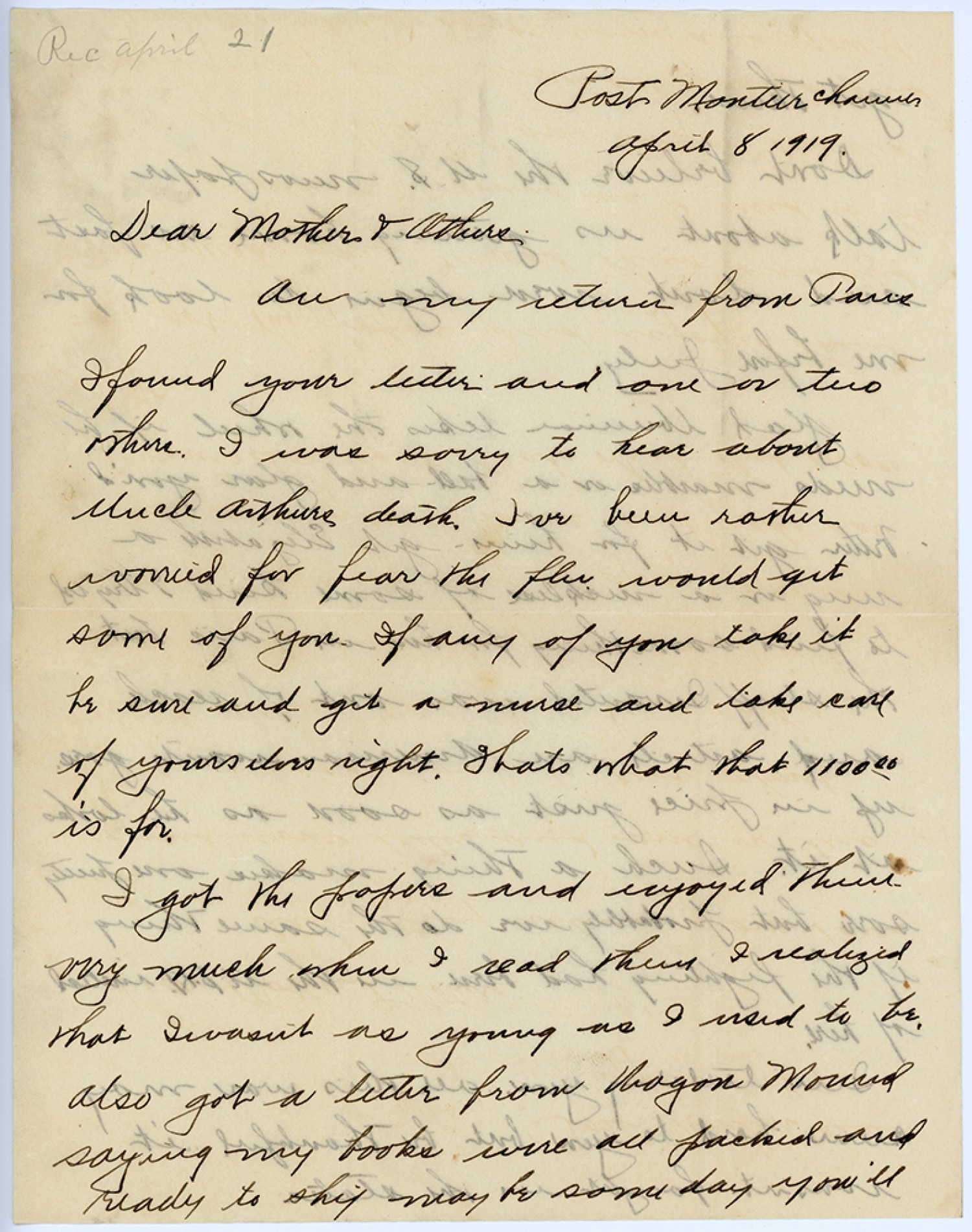 Rec April 21 Post Montierchaume April 8 1919 Dear Mother & Others On my return from Paris Ifound your letter and one or two others. I was sorry to hear about Uncle Arthurs death. Ive been rather worried for fear the flu would get some of you. If any of you take it be sure and get a nurse and take care of yourselves right. Thats what that [$1,100.00] is for. I got the papers and enjoyed them very much when I read them I realized that Iwasnt as young as I used to be. Also got a letter from Wagon Mound saying my books were all packed and ready to ship may be some day you’ll