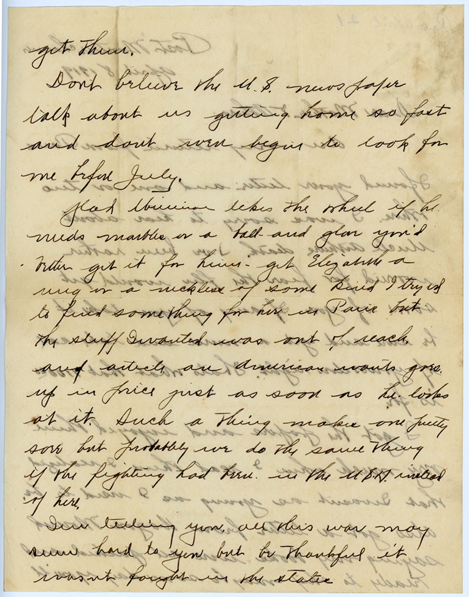 get them. Dont believe the U.S. newspaper talk about us getting home so fast and dont even begin to look for me before July. glad William likes the wheel if he needs marbles or a ball and glove you’d better get it for him - get Elizabeth a ring or a necklace of some kind I tryed to find something for her in Paris but the stuff Iwanted was out of reach. an article an American wants goes up in price just as soon as he looks at it. Such a thing makes one pretty sore but probably we do the same thing if the fighting had been in the U.S.A. instead of here. Im telling you, all this war may seem hard to you but be thankful it wasnt fought in the states
