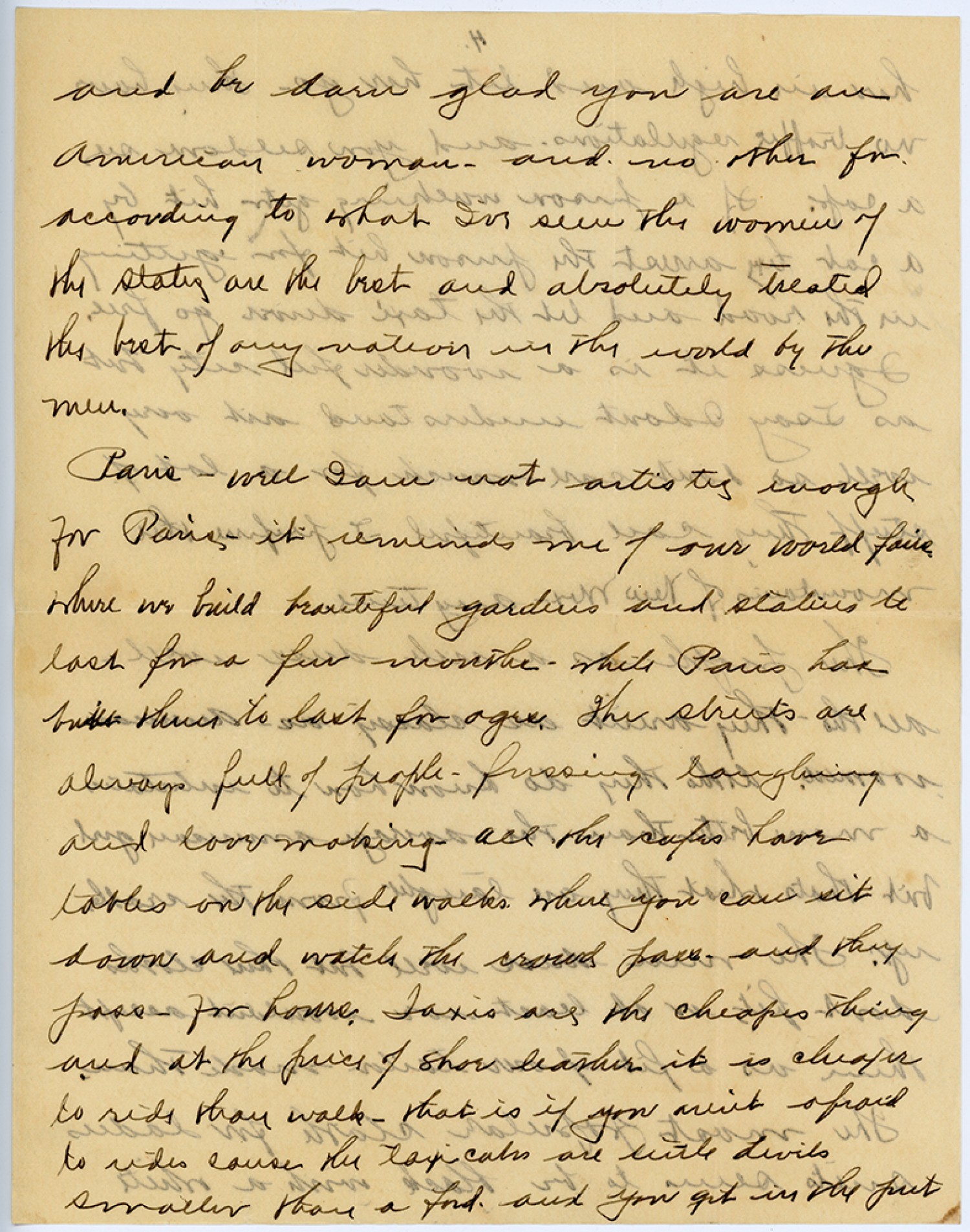 and be darn glad you are an American woman - and no other for according to what I’ve seen the women of the states are the best and absolutely treated the best of any nation in the world by the men. Paris - well Iam not artistic enough for Paris - it reminds me of our world fairs where we build beautiful gardens and statues to last for a few months - while Paris has built them to last for ages. The streets are always full of people - fussing laughing and love making - all the cafes have tables on the side walks where you can sit down and watch the crowd pass - and they pass for hours. Taxis are the cheapes thing and at the price of shoe leather it is cheaper to ride than walk - that is if you aren’t afraid to ride cause the taxi cabs are little devils smaller than a ford and you get in the put