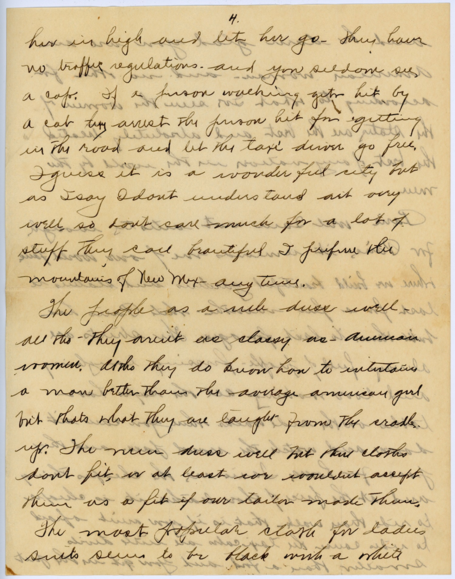 [page 4] her in high and let her go - They have no traffic regulations and you seldom see a cop. If a person walking gets hit by a cab they arrest the person hit for getting in the road and let the taxi driver go free. I guess it is a wonderful city but as Isay Idont understand art very well, so dont care much for a lot of stuff they call beautiful I preferre the mountains of [New Mexico] any time. The people as a rule dress well - all tho they aren’t as classy as American women. Altho they do know how to entertain a man better than the average american girl but thats what they are taught from the cradle up. The men dress well but there cloths dont fit, or at least we wouldnt accept them as a fit if our tailor made them. The most popular cloth for ladies suits seem to be black with a white