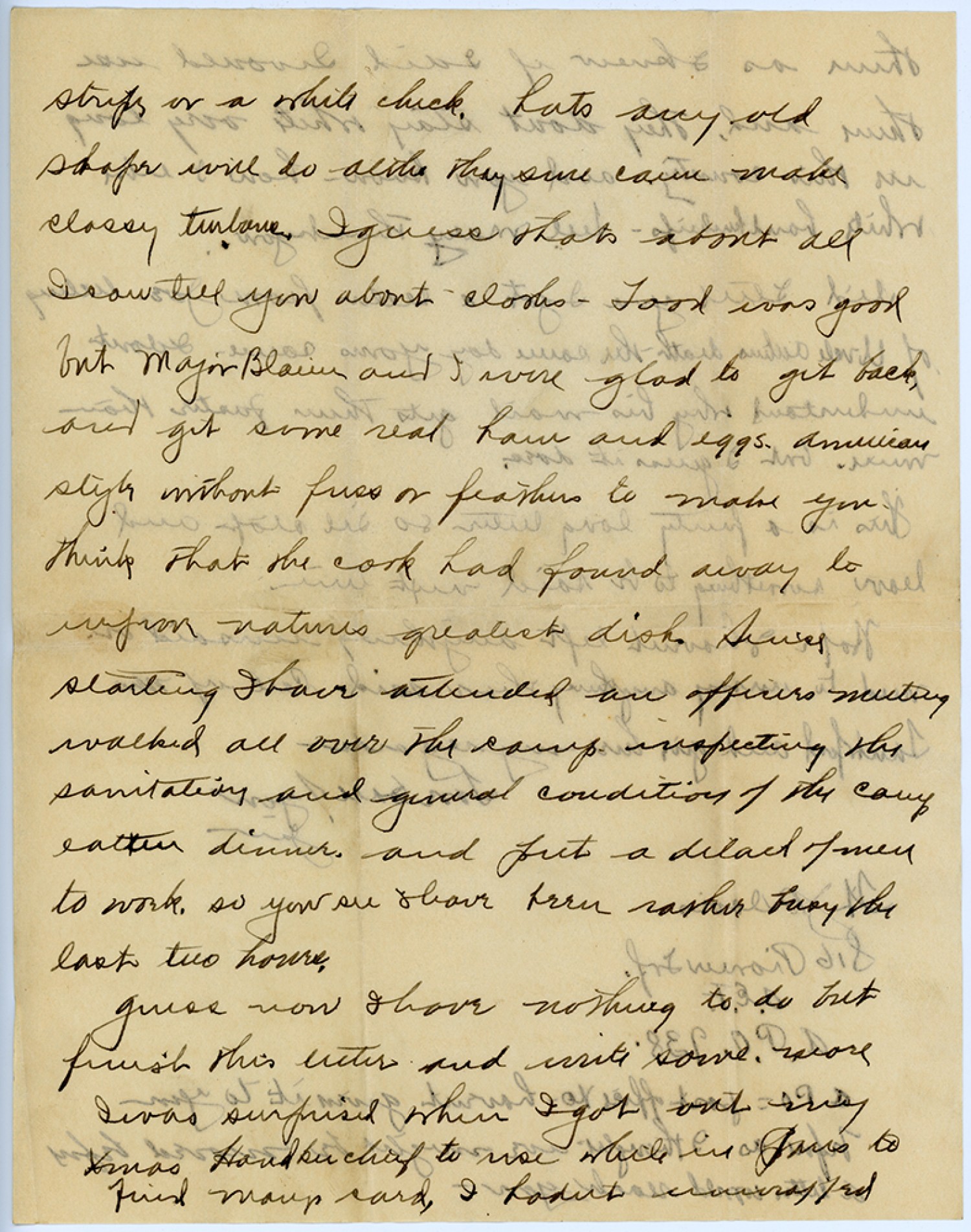 stripe or a white check. hats any old shape will do altho they sure can make classy turbans. Iguess thats about all Ican tell you about cloths - Food was good but Major Blaine and I were glad to get back, and get some real ham and eggs. american style without fuss or feathers to make you think that the cook had found away to improve natures greatest dish. Since starting Ihave attended an officers meeting walked all over the camp inspecting the sanitation and general conditions of the Camp eaten dinner and put a detach of men to work. so you see Ihave been rather busy the last two hours. guess now Ihave nothing to do but finish this letter and write some more Iwas surprised when Igot out my Xmas Handkerchief to use while in Paris to find Marys card, I hadnt unwrapped