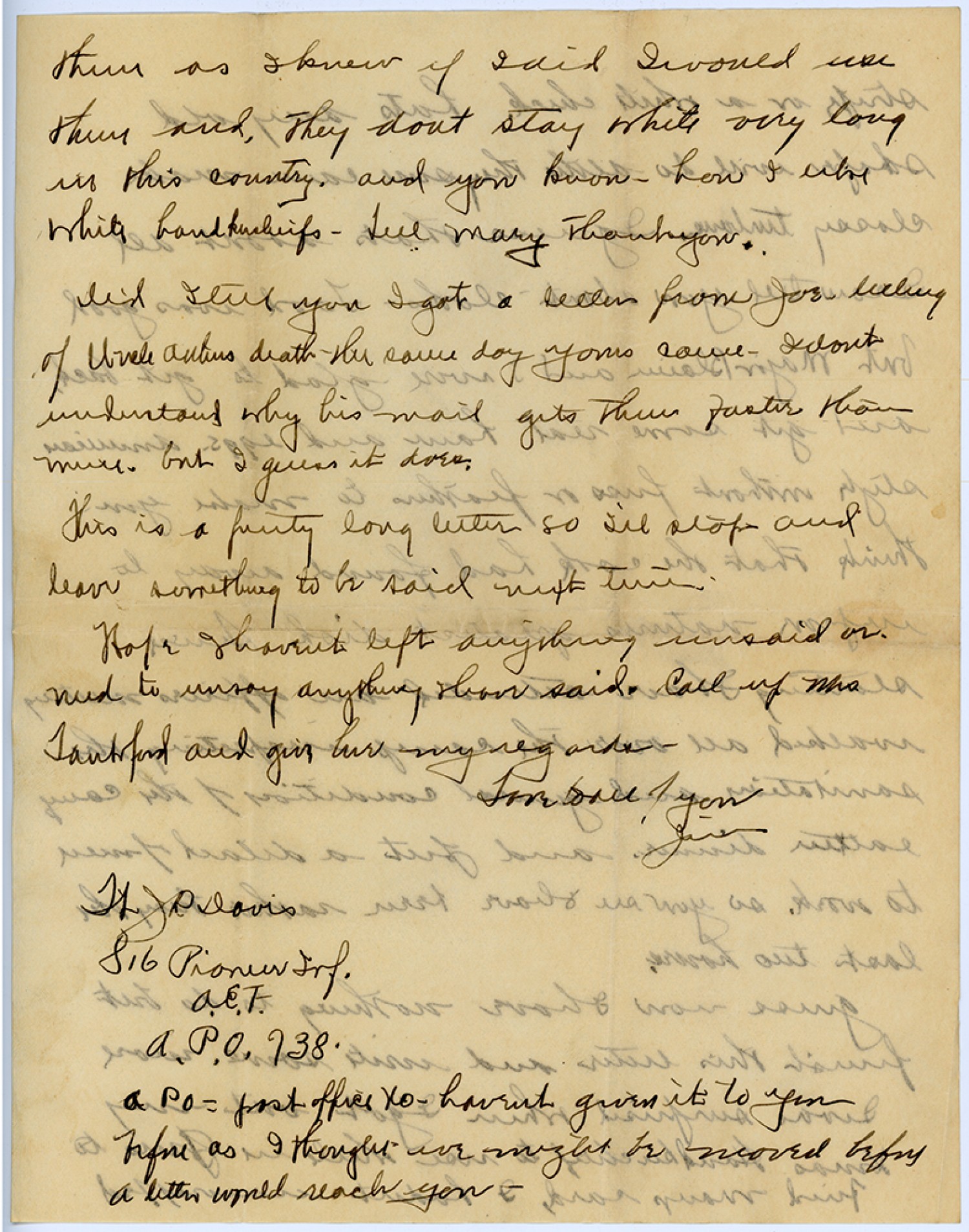them as Iknew if Idid Iwould use them and they dont stay white very long in this country and you know how I like white handkerchiefs - Tell Mary Thankyou. Did Itell you Igot a letter from Joe telling of Uncle Arthurs death the same day yours came - Idont understand why his mail gets thru faster than mine, but I guess it does. This is a pretty long letter so I’ll stop and leave something to be said next time. Hope Ihavent left anything unsaid or need to unsay anything Ihave said. Call up Mrs Lankford and give her my regards - Love to all of you Jim Lt JR Davis 816 Pioneer Inf. A.E.F. A.P.O. 738 APO = post office No - havent given it to you before as I thought we might be moved before a letter would reach you -