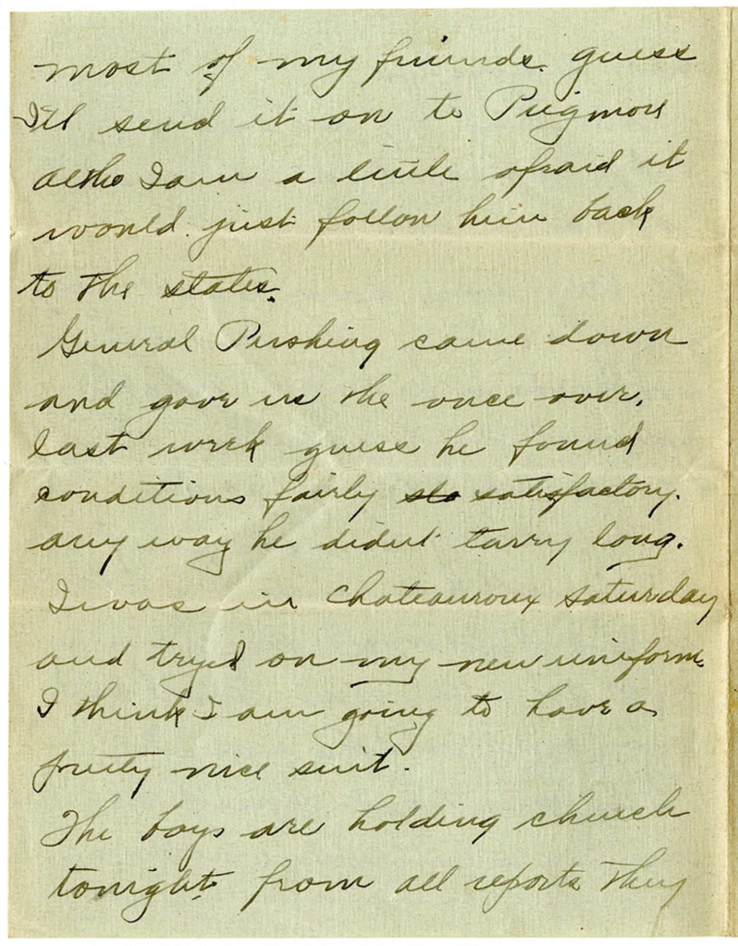 most of my friends. guess I’ll send it on to Prigmore altho Iam a little afraid it would just follow him back to the states. General [John] Pershing came down and gave us the once over last week guess he found conditions fairly satisfactory. any way he didnt tarry long. Iwas in Chateauroux Saturday and tryed on my new uniform. I think I am going to have a pretty nice suit. The boys are holding church tonight from all reports they