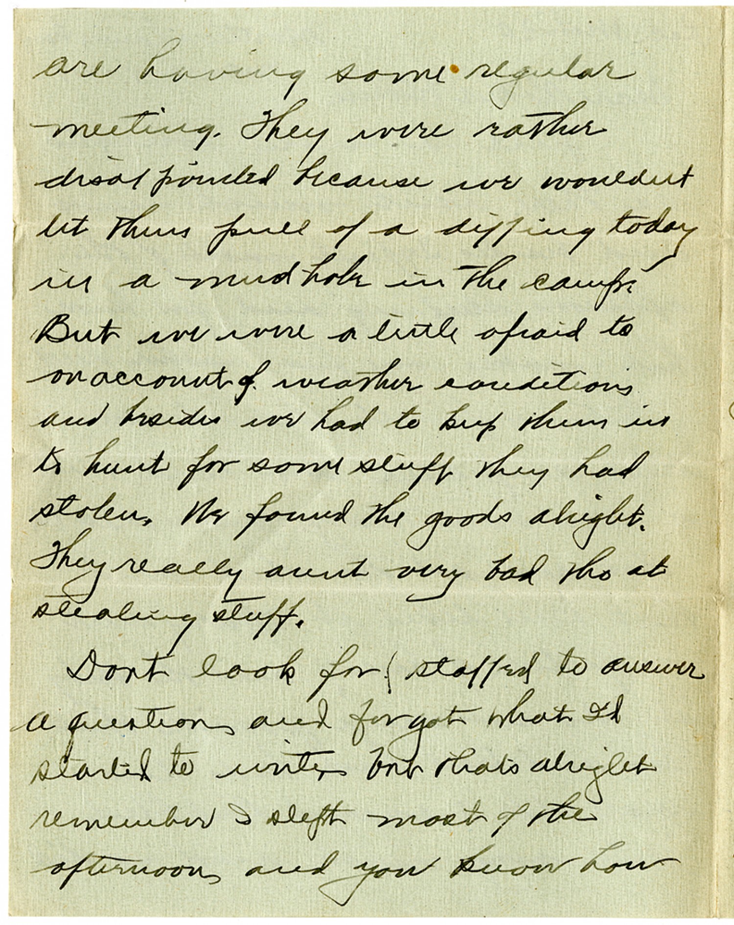 are having some regular meeting. They were rather disappointed because we wouldnt let them pull of a dipping today in a mud hole in the camp. But we were a little afraid to on account of weather conditions and besides we had to keep them in to hunt for some stuff they had stolen. We found the goods alright. They really arent very bad tho at stealing stuff. Dont look for (stopped to answer a question and forgot what I’d started to write but thats alright remember I slept most of the afternoon and you know how