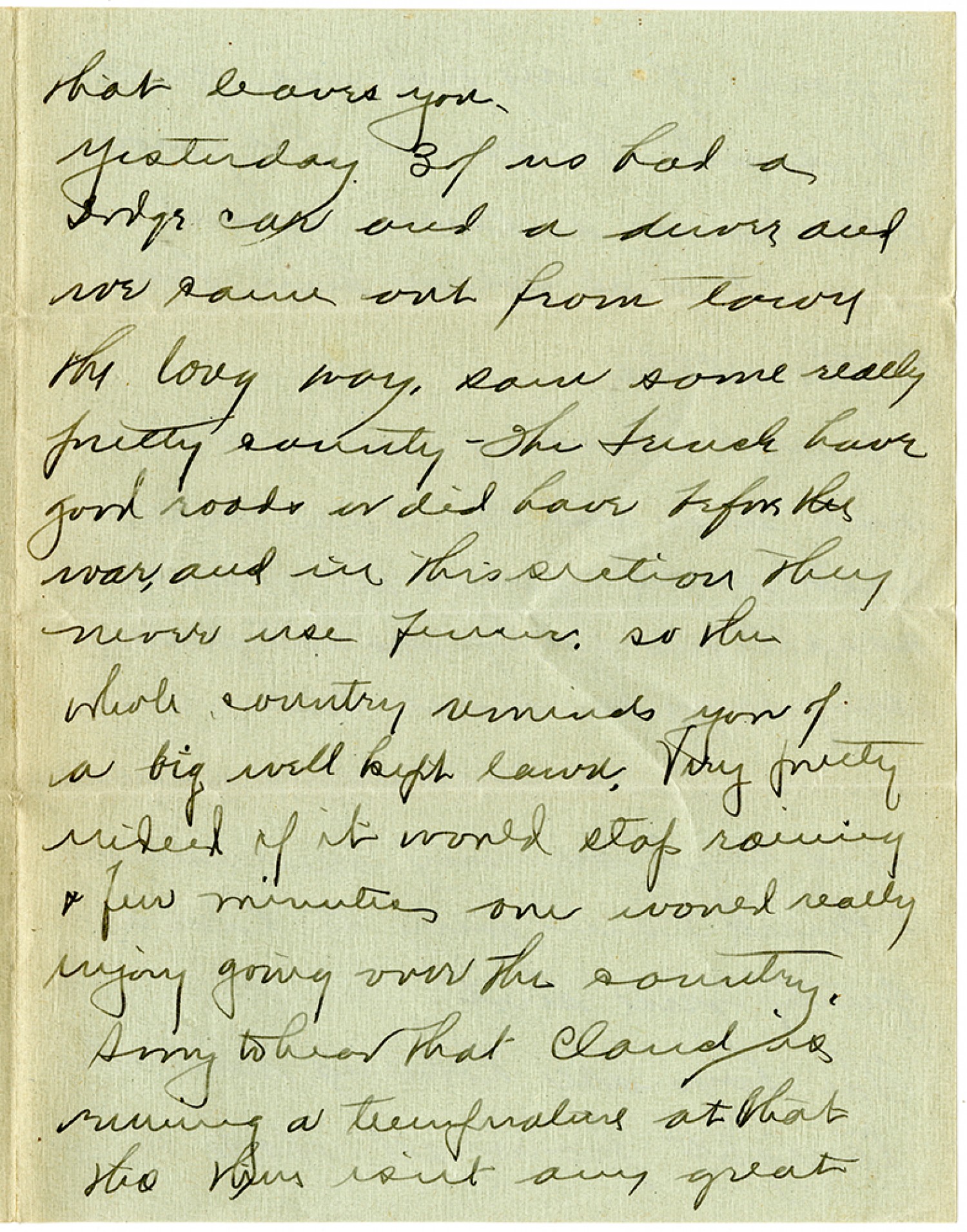 that leaves you. Yesterday 3 of us had a Dodge car and a driver and we came out from town the long way. saw some really pretty country - The French have good roads or did have before the war, and in this section they never use [ms illegible: 1 wd] so the whole country reminds you of a big well kept lawn. Very pretty indeed if it would stop raining a few minutes one would really enjoy going over the country. Sorry to hear that Claud is running a temperature at that tho there isnt any great