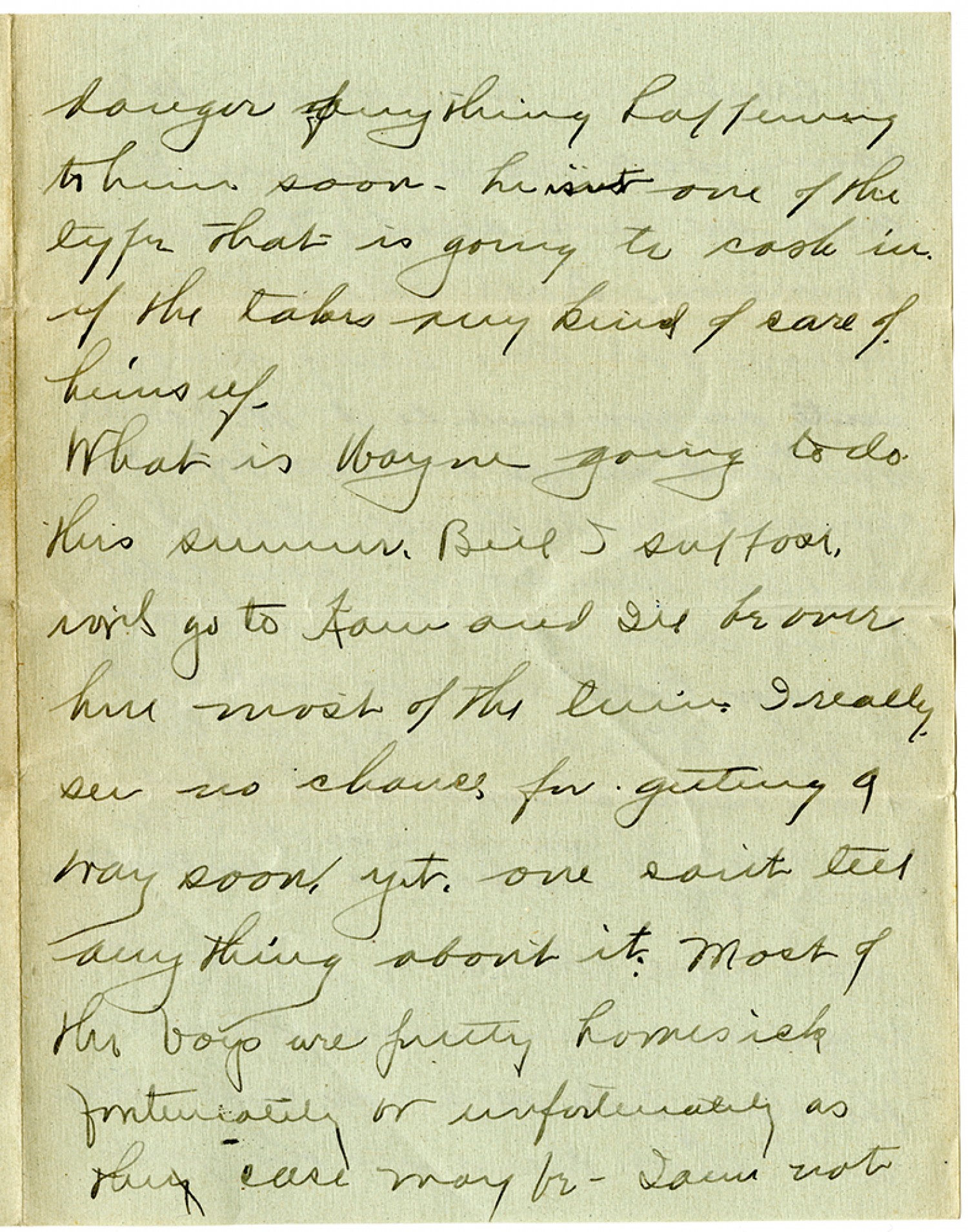 danger of anything happening to him soon - he isnt one of the types that is going to cash in if he takes any kind of care of himself. What is Wayne going to do this summer. Bill I suppose, will go to [Kansas] and Ill be over here most of the time. I really see no chance for getting a way soon, yet, one can’t tell any thing about it. Most of the boys are pretty homesick fortunately or unfortunately as the case may be - Iam not