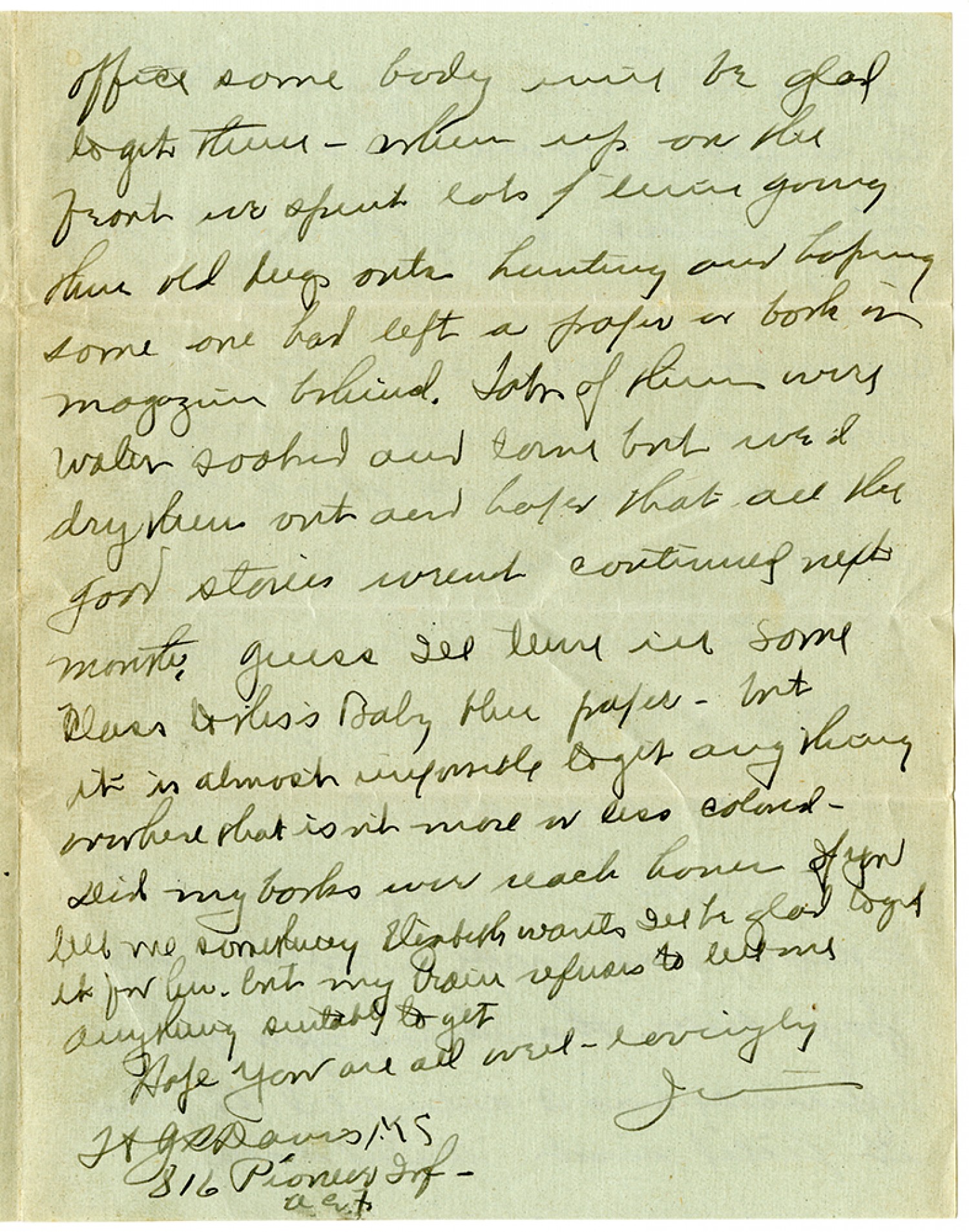 office some body will be glad to get them - when up on the front we spent lots of time going thru old dug outs hunting and hoping some one had left a paper or book or magazine behind. Lots of them were water soaked and torne but we’d dry them out and hope that all the good stories werent continued next month. guess I’ll turn in some class to this Baby blue paper - but it is almost impossible to get any thing overhere that isn’t more or less colored - Did my books ever reach home If you tell me something Elizabeth wants Ill be glad to get it for her, but my brain refuses to tell me anything suitable to get Hope you and all well - lovingly Jim Lt JR Davis M S 816 Pioneer Inf- A.E.F.