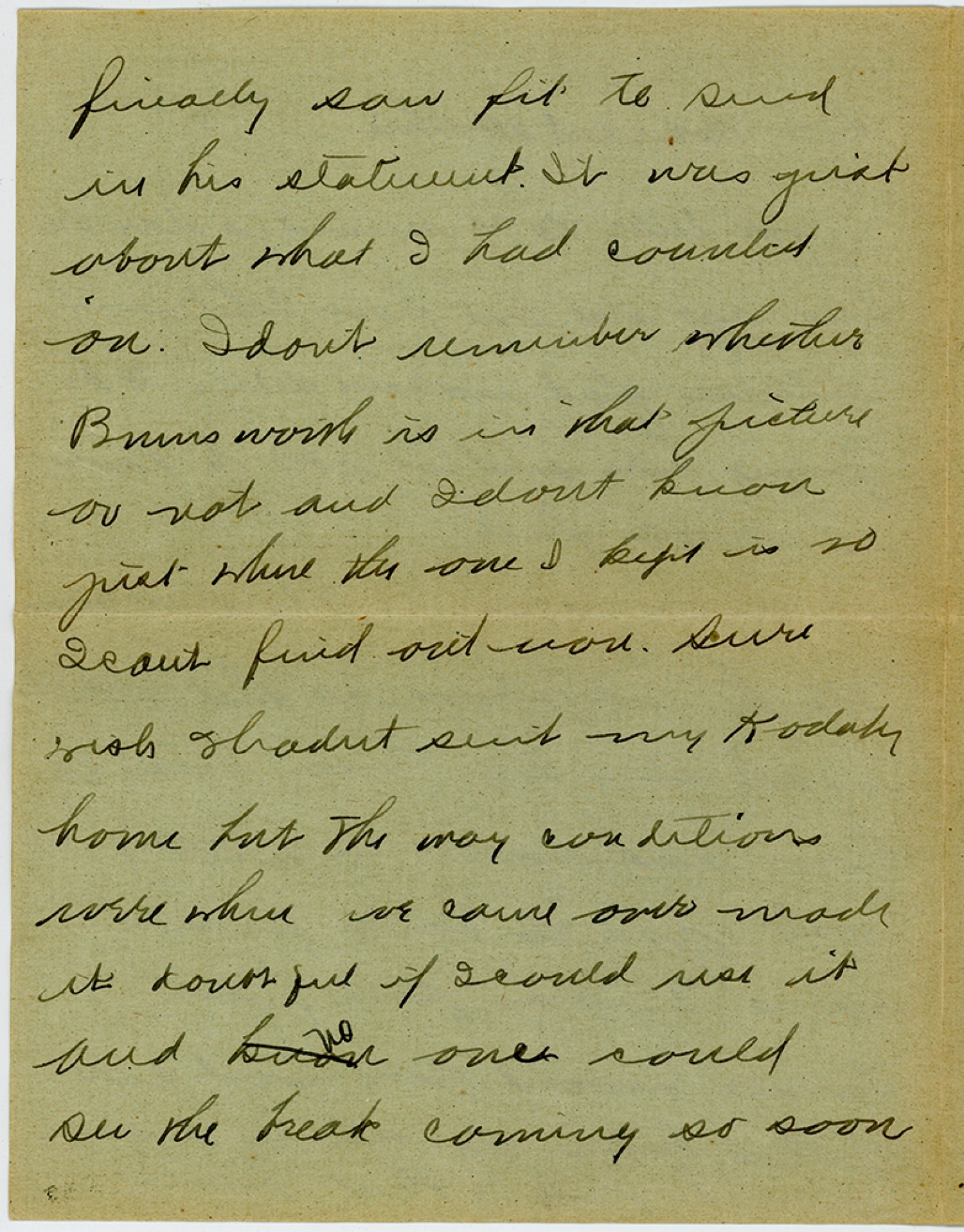 finally saw fit to send in his statement. It was just about what I had counted on. Idont remember whether Burnsworth is in that picture or not and Idont know just where the one I kept is so Icant find out now. sure wish Ihadnt sent my Kodak home but the way conditions were where we came over made it doubtful if Icould use it and no one could see the break coming so soon