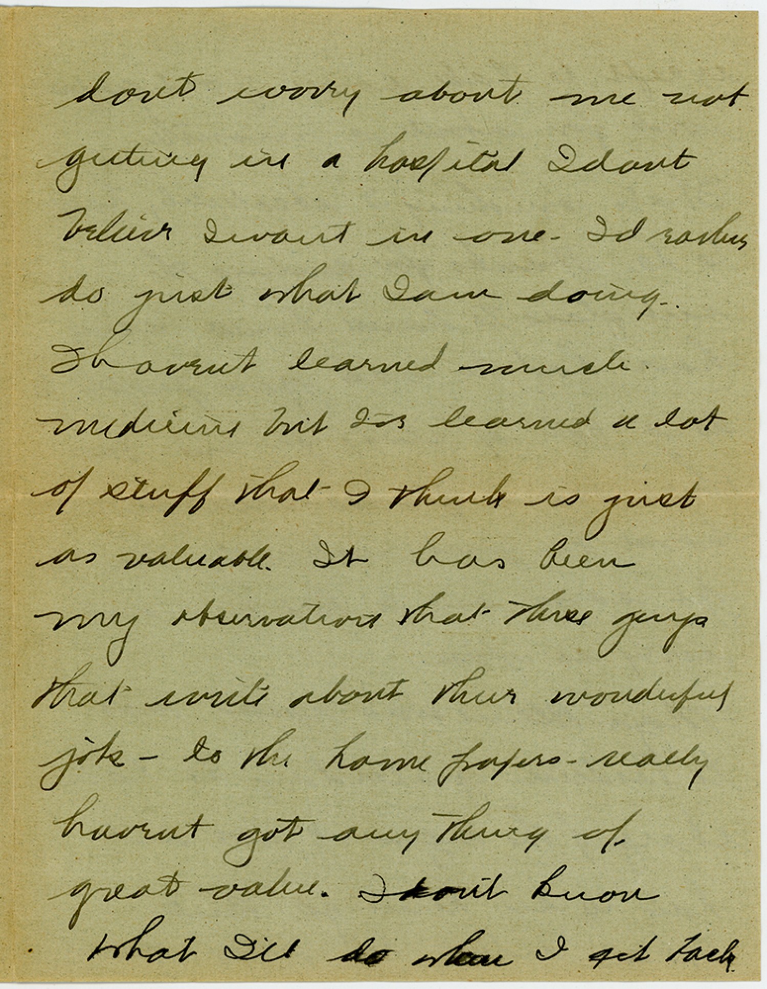 dont worry about me not getting in a hospital Idont believe Iwant in one - Id rather do just what Iam doing. Ihavent learned much medicine but I’ve learned a lot of stuff that I think is just as valuable. It has been my observation that these guys that write about their wonderful jobs - to the home papers - really havent got any thing of great value. Idont know what I’ll do when I get back
