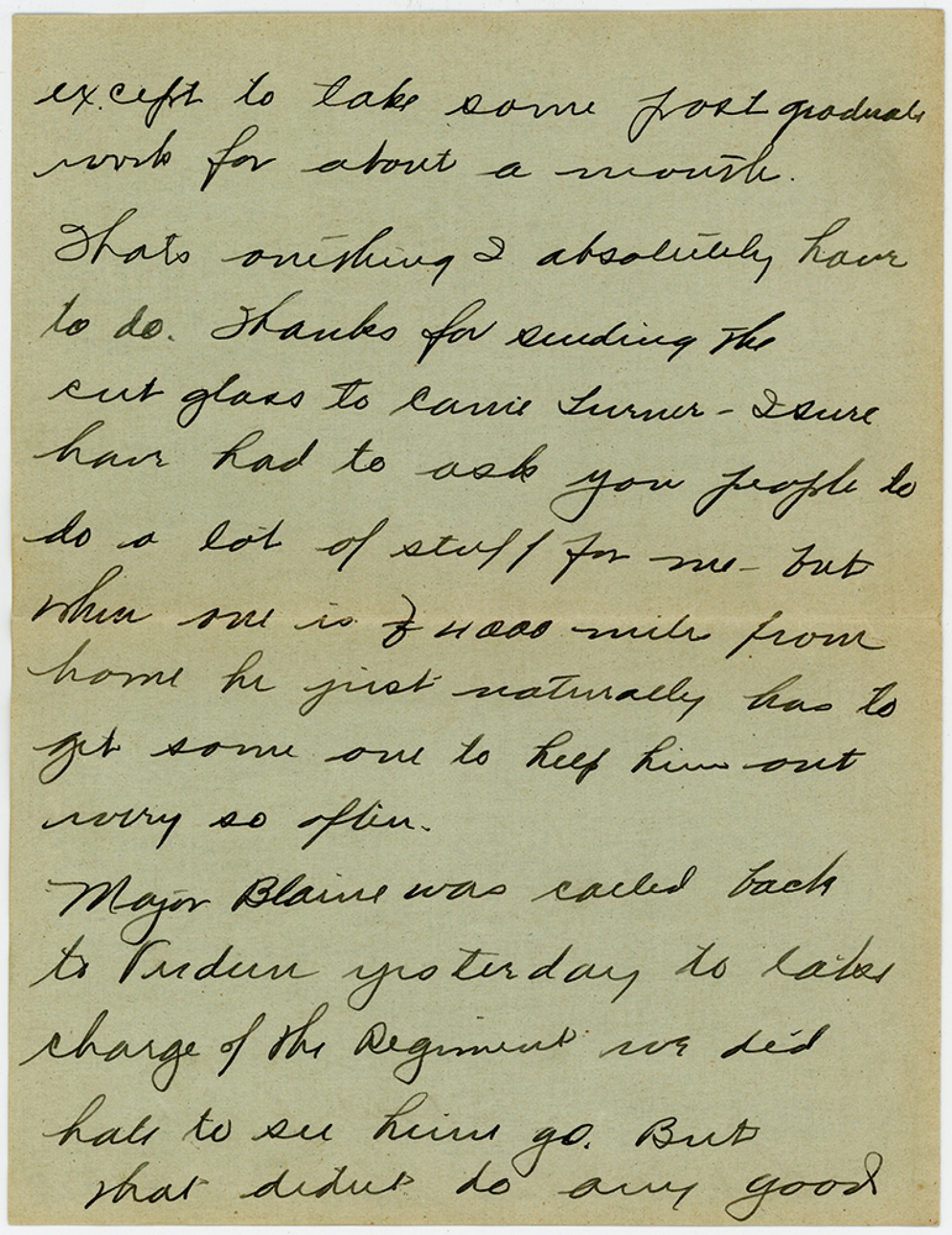 except to take some post graduate work for about a month. Thats onething I absolutely have to do. Thanks for sending the cut glass to Carrie Turner - Isure have had to ask you people to do a lot of stuff for me - but when one is 4000 miles from home he just naturally has to get some one to help him out every so often. Major Blaine was called back to Verdun yesterday to take charge of the Regiment we did hate to see him go. But that didnt do any good