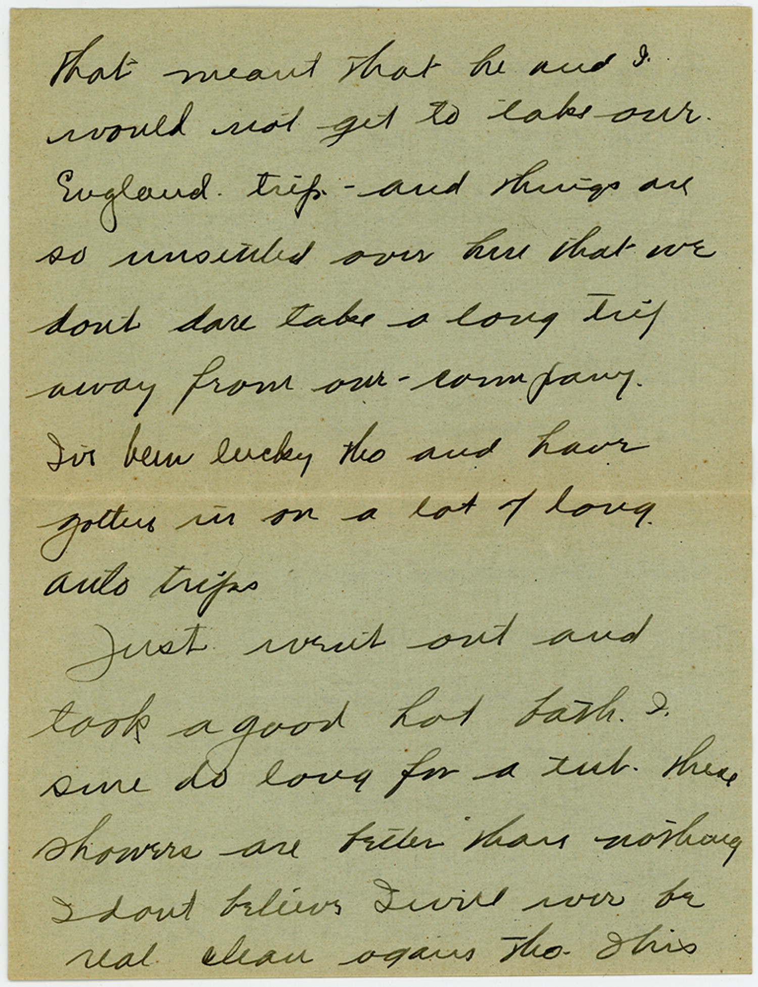 that meant that he and I would not get to take our England trip - and things are so unsettled over here that we dont dare take a long trip away from our company. I’ve been lucky tho and have gotten in on a lot of long auto trips Just went out and took a good hot bath. I sure do long for a tub. these showers are better than nothing Idont believe Iwill ever be real clean again tho. This
