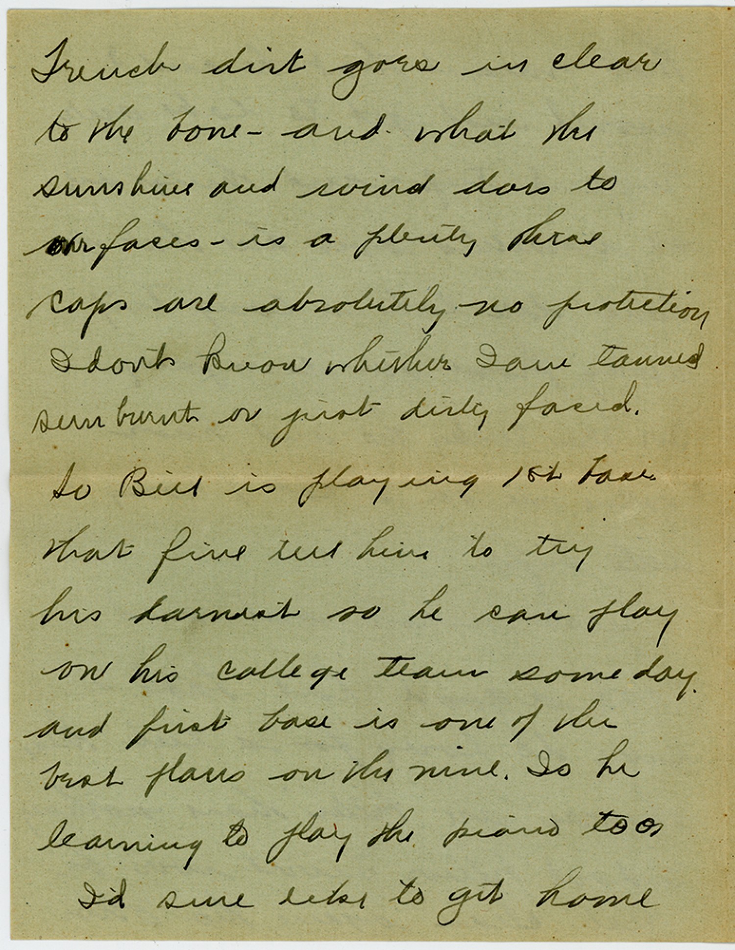 French dirt goes in clear to the bone - and what the sunshine and wind does to our faces is a plenty these caps are absolutely no protection Idont know whether Iam tanned sun burnt or just dirty faced. So Bill is playing 1st base that fine tell him to try his darnest so he can play on his college team some day and first base is one of the best places on the nine. Is he learning to play the piano too I’d sure like to get home