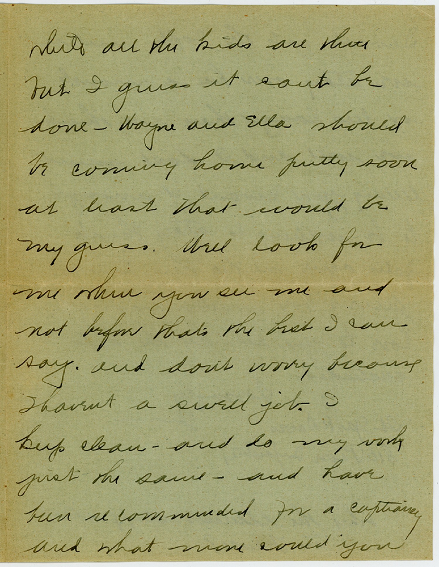 while all the kids are there but I guess it cant be done - Wayne and Ella should be coming home pretty soon at least that would be my guess. Well look for me when you see me and not before thats the best I can say and dont worry because Ihavent a swell job. I keep clean - and do my work just the same - and have been recommended for a Captiancy and what more could you