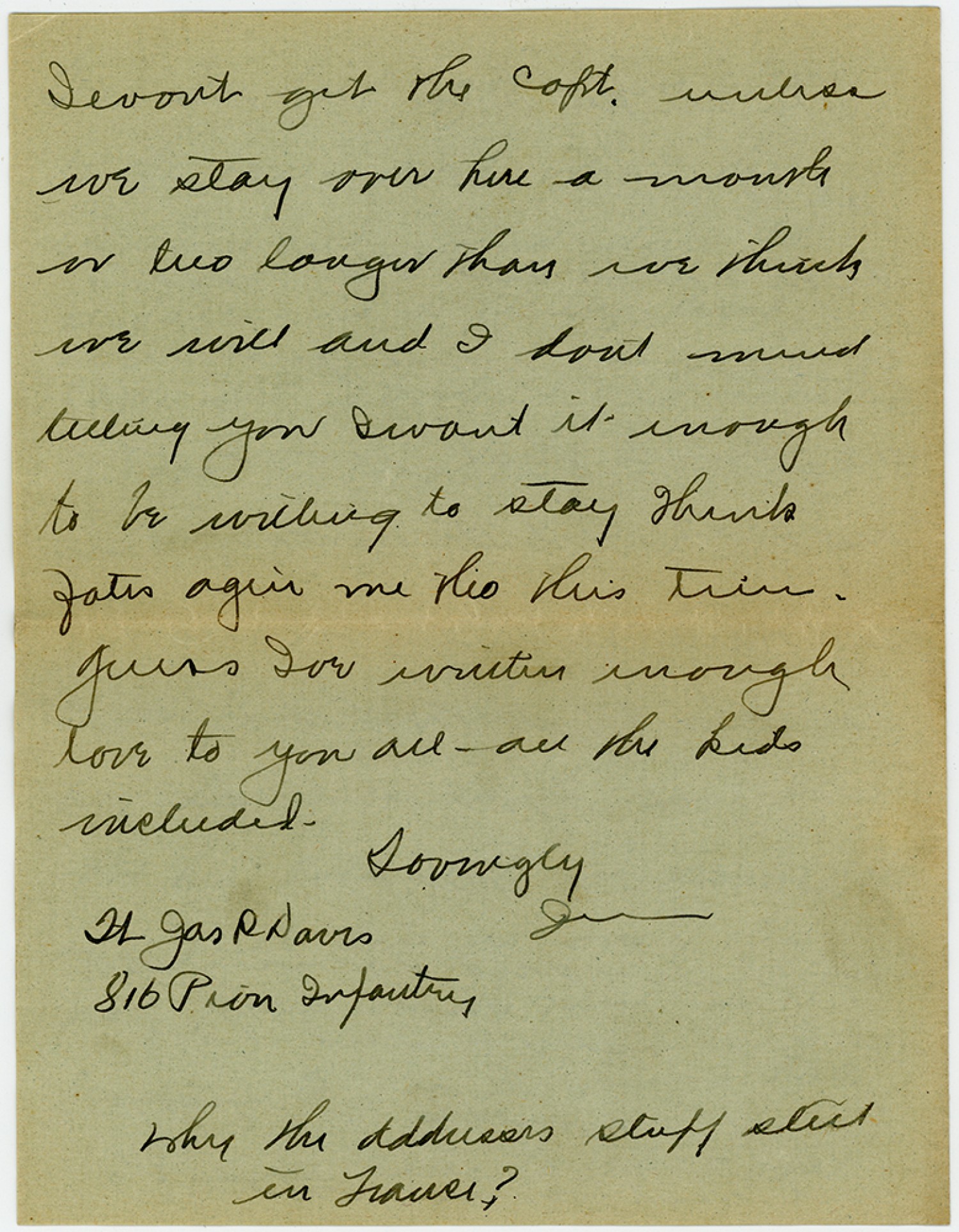 Iwont get the Capt. unless we stay over here a month or two longer than we think we will and I dont mind telling you Iwant it enough to be willing to stay think fates agin me tho this time. guess Ive written enough love to you all - all the kids included - Lovingly Jim Lt [James] R Davis 816 Pion Infantry Why the addresses stuff still in France?