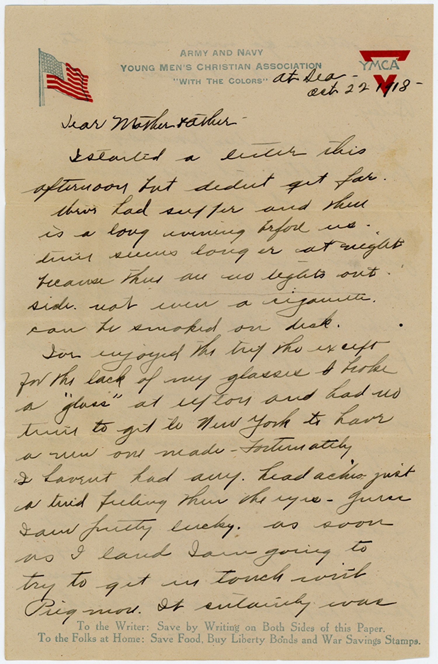 at sea - [October] 22 1918 - Dear Mother & Other - Istarted a letter this afternoon but didnt get far then had supper and there is a long evening before us. time seems longer at night because there are no lights out side not even a cigarette can be smoked on deck. Ive enjoyed the trip tho except for the lack of my glasses I broke a “glass” at [Camp Upton] and had no time to get to New York to have a new one made - Fortunately I havent had any head aches just a tired feeling thru the eyes - guess Iam pretty lucky. as soon as I land Iam going to try to get in touch with Prigmore. It certainly was