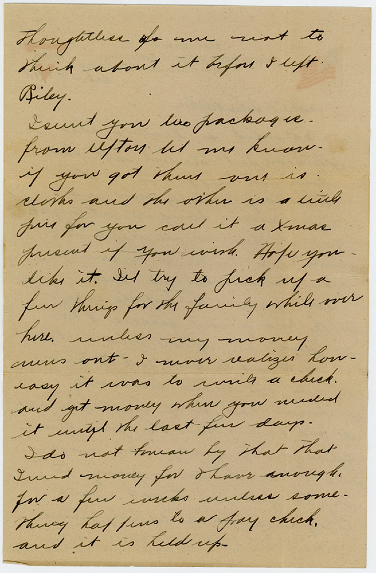 thoughtless of me not to think about if before I left [Fort Riley] Isent you two packages from [Camp Upton] let me know if you got them one is cloths and the other is a little fur for you call it a Xmas present if you wish. Hope you like it. I’ll try to pick up a few things for the family while over here. unless my money runs out - I never realizes how easy it was to write a check and get money when you needed it until the last few days. Ido not mean by that that Ineed money for Ihave enough for a few weeks unless something happens to a pay check and it is held up.