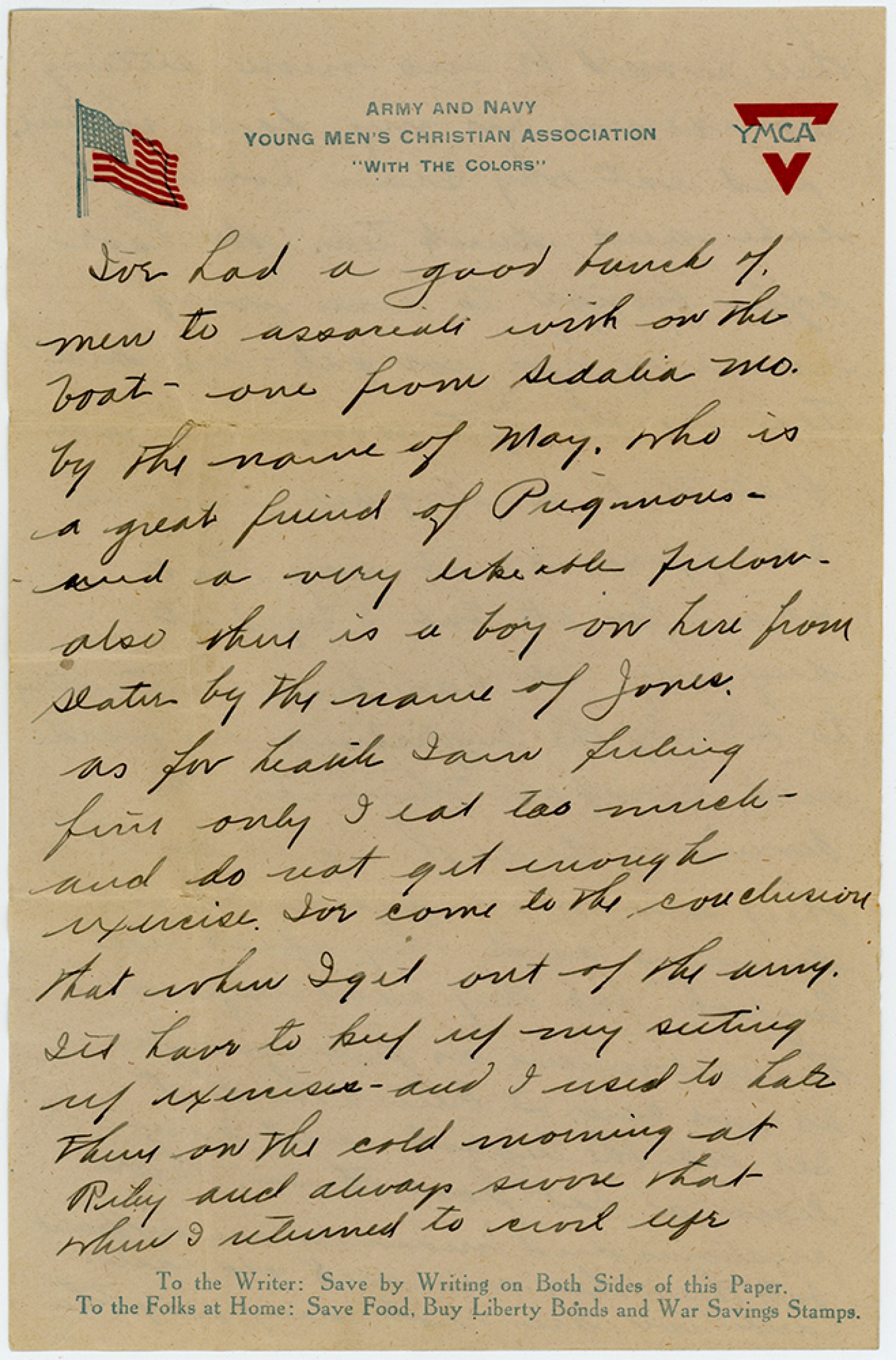 Ive had a good bunch of men to associate with on the boat - one from Sedalia [Missouri] by the name of May. who is a great friend of Prigmores and a very likeable fellow - also there is a boy on here from Slater by the name of Jones. as for health Iam feeling fine only I eat too much and do not get enough exercise. I’ve come to the conclusion that when Iget out of the army I’ll have to keep up my setting up exercises and I used to hate them on the cold morning at [Fort Riley] and always swore that when I returned to civil life