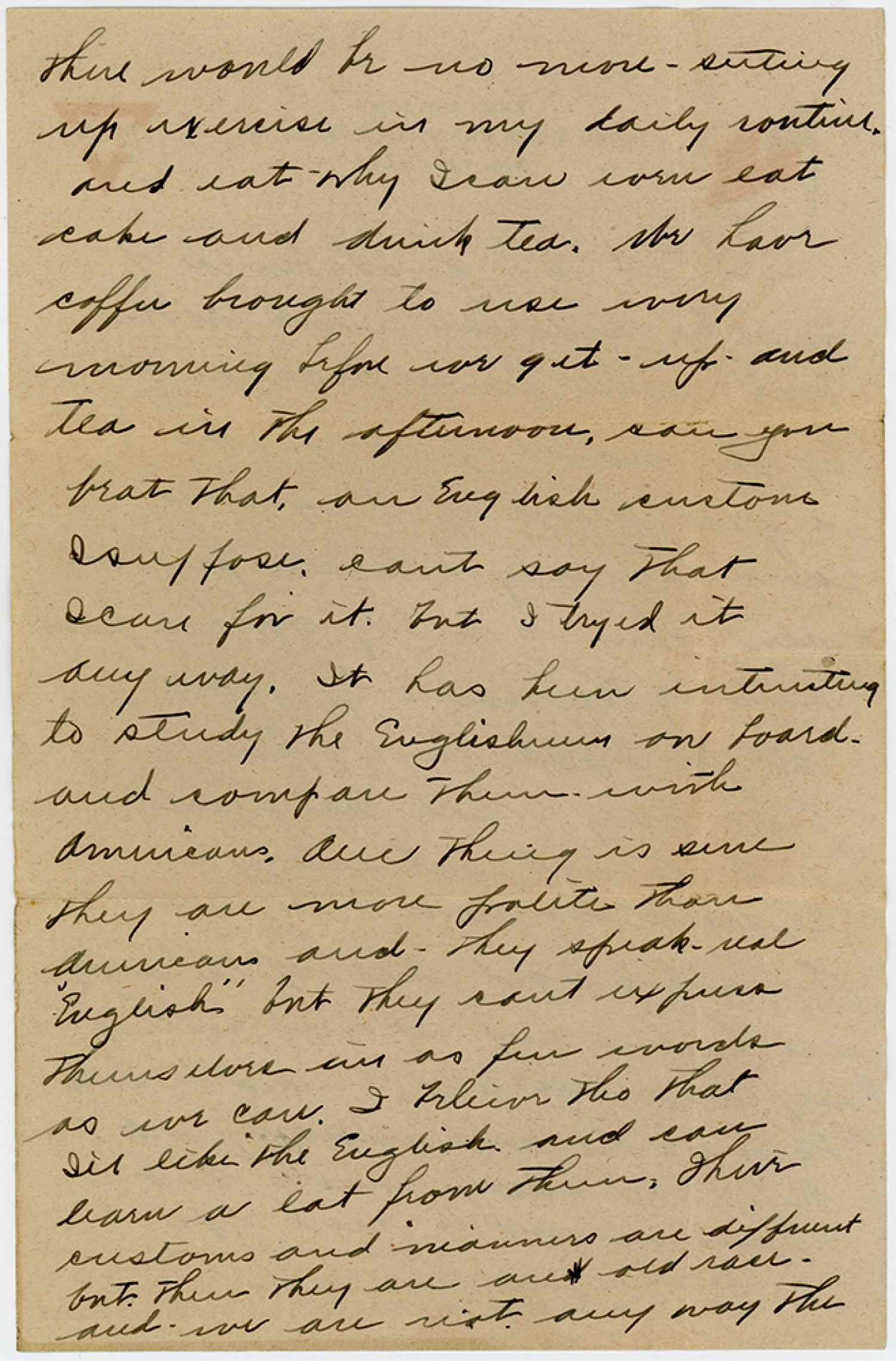 there would be no more setting up exercise in my daily routine and eat why Ican even eat cake and drink tea. We have coffee brought to use every morning before we get up and tea in the afternoon, can you beat that, an English custom Isuppose. cant say that Icare for it, but I tried it any way. It has been interesting to study the Englishmen on board and compare them with Americans. One thing is sure they are more polite than Americans and they speak real “English” but they cant express themselves in as fun words as we can. I believe tho that I’ll like the English and can learn a lot from them. Their customs and manners are different but then they are an old race and we are not any way the