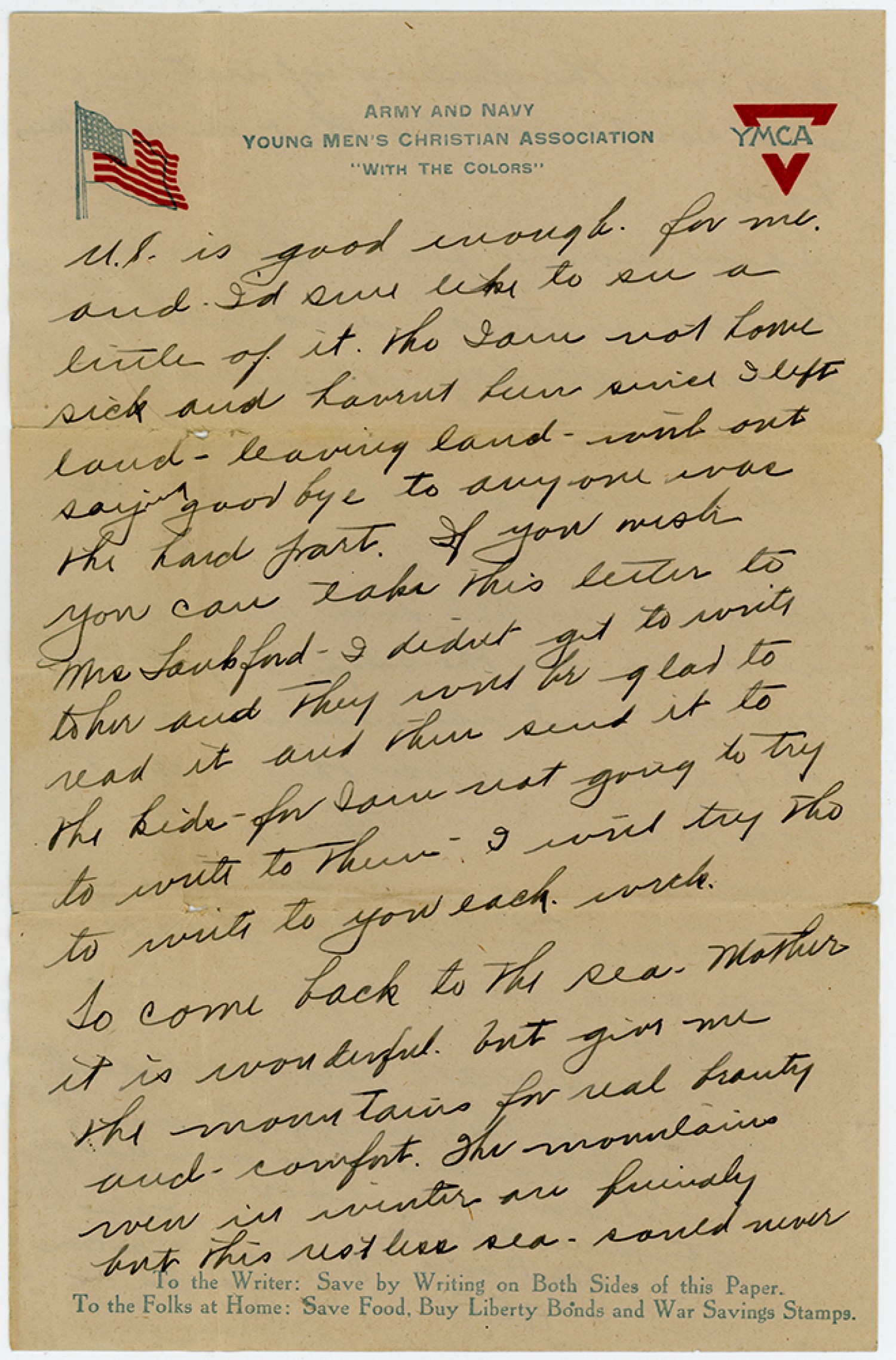 U.S. is good enough for me and I’d sure like to see a little of it. Tho Iam not home sick and havent been since I left land - leaving land - with out saying good bye to any one was the hard part. If you wish you can take this letter to Mrs Lankford - I didn’t get to write to her and they will be glad to read it and then send it to the kids for Iam not goint to try to write to them - I will try tho to write to you each week. To come back to the sea - Mother it is wonderful but give me the mountains for real beauty and comfort. The mountains even in winter are friendly but this restless sea could never