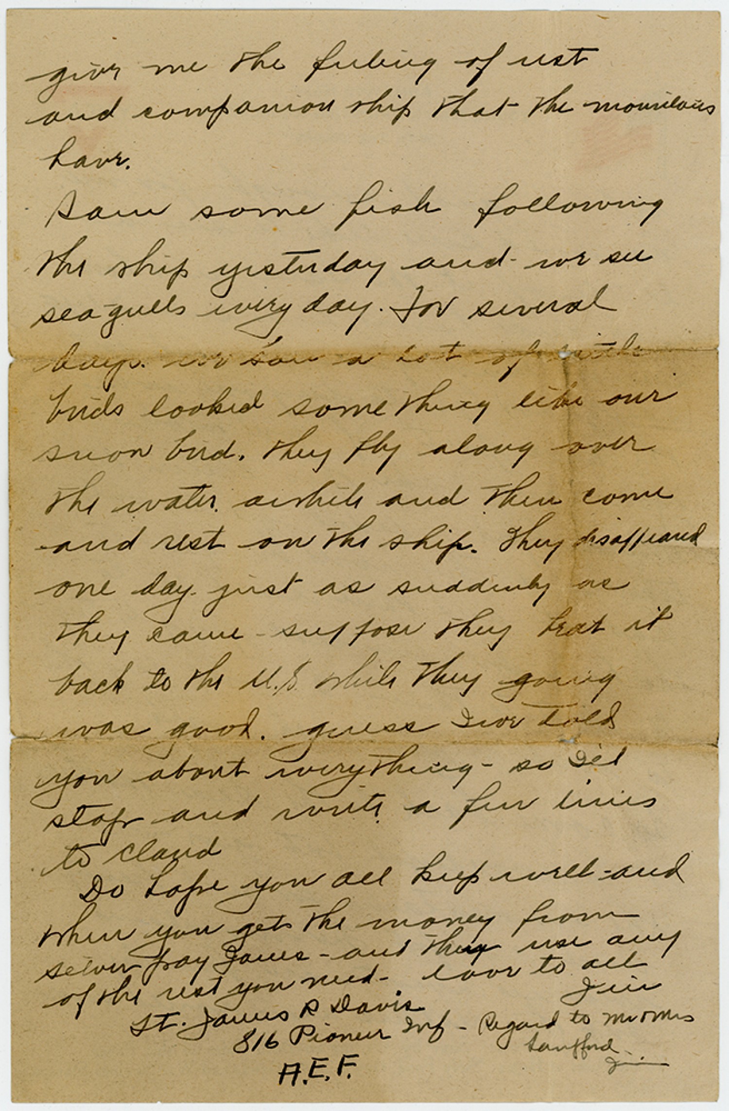 give me the feeling of rest and companionship that the mountains have. Saw some fish following the ship yesterday and we see seagulls every day. For several days we saw a lot of little birds looked some thing like our snow bird. They fly along over the water awhile and then come and rest on the ship. They disappeared one day just as suddenly as they came - suppose they beat it back to the U.S. while they going was good. guess Ive told you about everything - so I’ll stop and write a few lines to Claud Do hope you all keep well - and when you get the money from Silver pay James - and then use any of the rest you need - love to all Jim Lt. James R Davis 816 Pioneer Inf A.E.F. - Regard to Mr & Mrs Lankford Jim