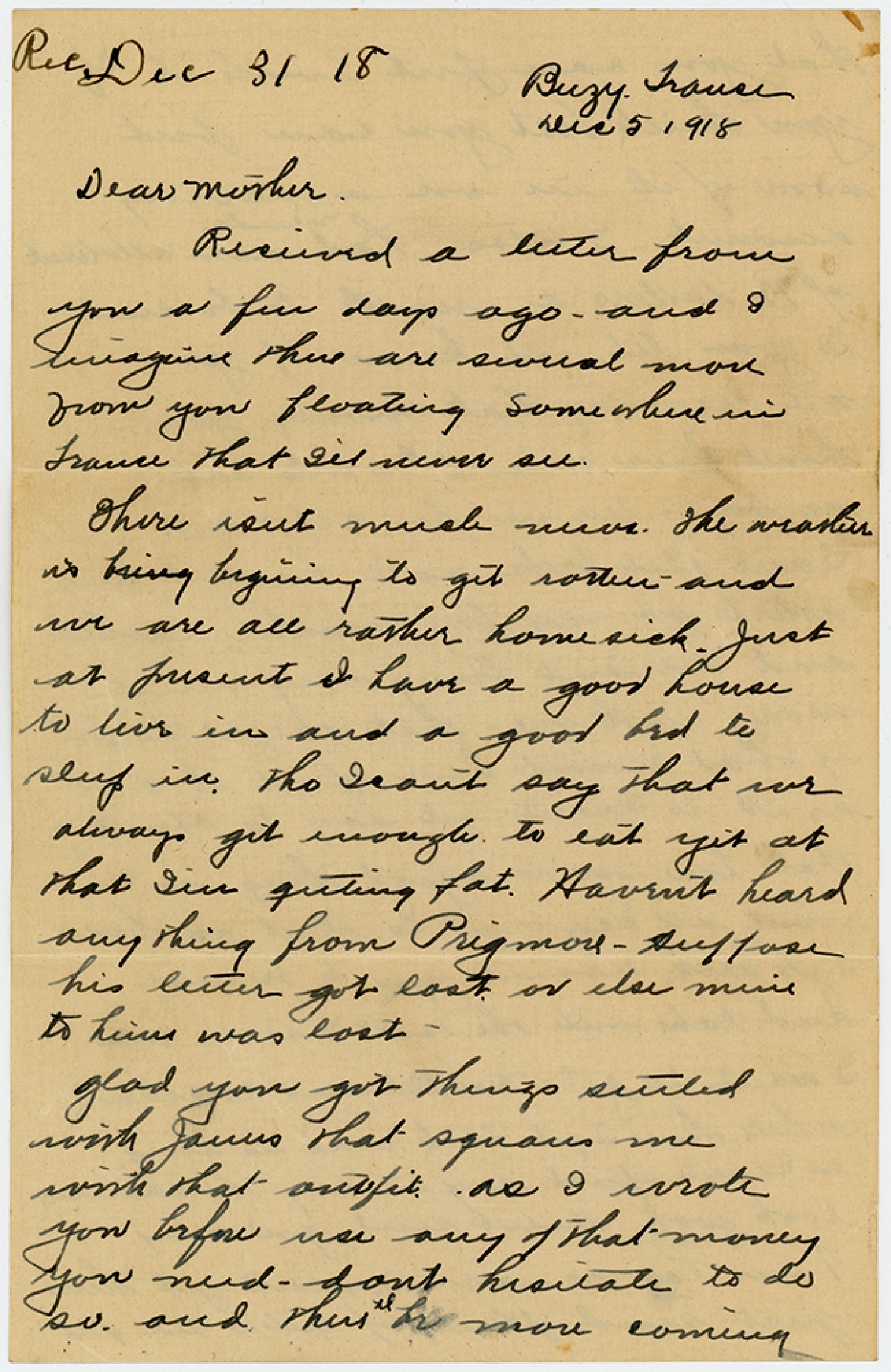 Rec. [December] 31 [1918] [Bouzy] France [December] 5 1918 Dear Mother Received a letter from you a few days ago - and I imagine there are several more from you floating somewhere in France that I’ll never see. There isnt much news. The weather is beginning to get rotten and we are all rather home sick. Just at present I have a good house to live in and a good bed to sleep in. tho Icant say that we always get enough to eat yet at that I’m getting fat. Havent heard anything from Prigmore - suppose his letter got lost or else mine to him was lost - glad you got things settled with James that squares me with that outfit as I wrote you before use any of that money you need - dont hesitate to do so. and there’ll be more coming