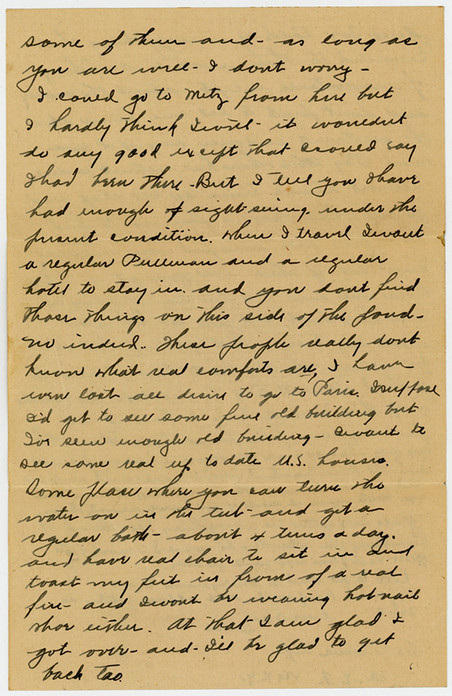 some of them and - as long as you are well - I dont worry - I could go to Metz from here but I hardly think Iwill - it wouldnt do any good except that Icould say Ihad been there - But I tell you Ihave had enough of sight seeing under the present condition. When I travel Iwant a regular Pullman and a regular hotel to stay in, and you dont find those things on this side of the pond - no indeed. These people really dont know what real comforts are, I have even lost all desire to go to Paris. Isuppose I’d get to see some fine old building but I’ve seen enough old building - Iwant to see some real up to date U.S. houses. Some place where you can turn the water on in the tub - and get a regular bath - about 4 turns a day. and have real chair to sit in and toast my feet in from of a real fire - and Iwont be wearing hob nail shoe either. At that I am glad I got over - and - I’ll be glad to get back too.