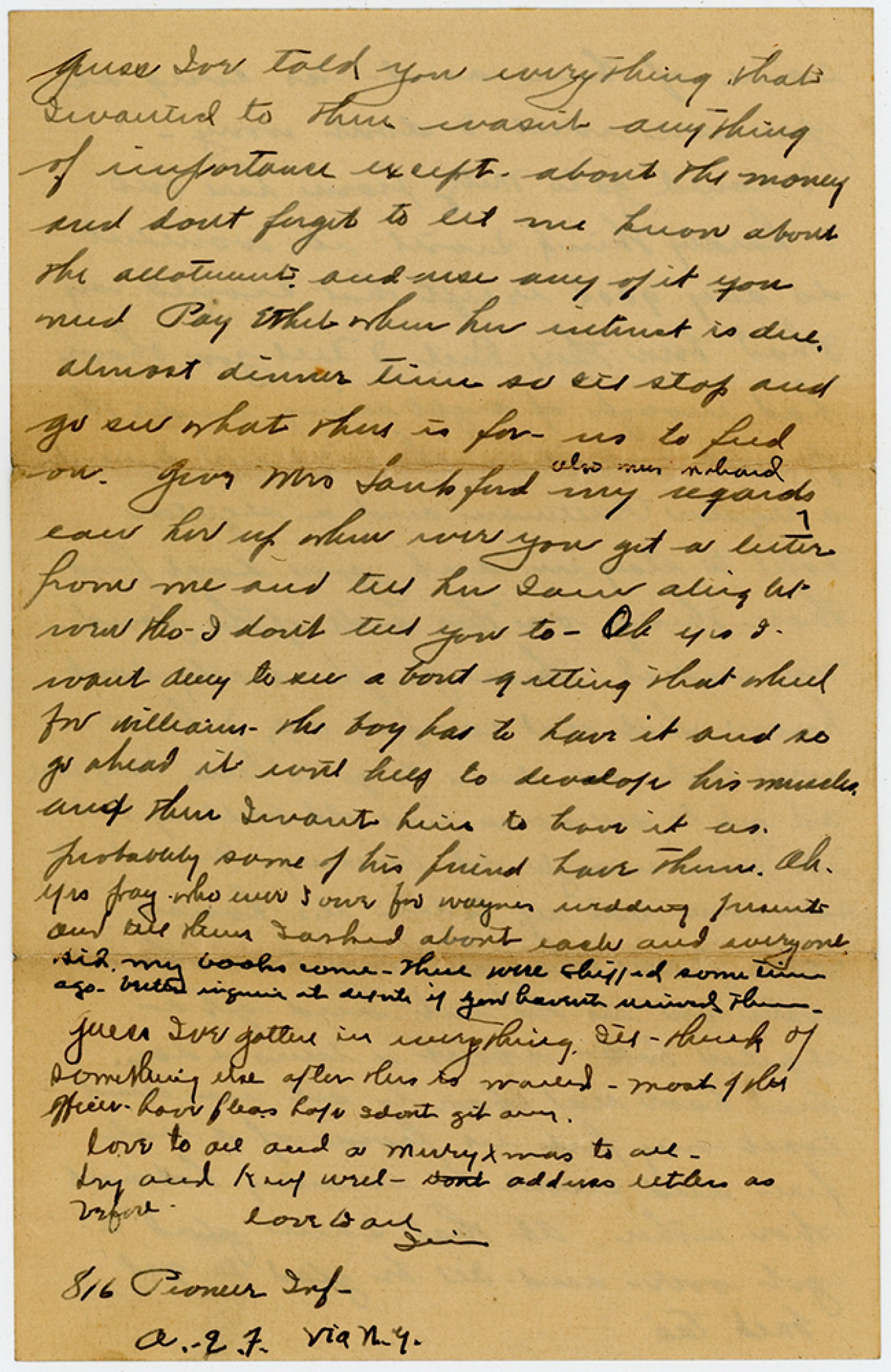 guess Ive told you everything that Iwanted to there wasn’t anything of importance except. about the money and dont forget to let me know about the allotment and use any of it you need Pay Ethel when her interest is due. almost dinner time so I’ll stop and go see what there is for us to feed on. give Mrs Lankford my regards also Mrs Nehard call her up when ever you get a letter from me and tell her Iam alright even tho I dont tell you to - Oh yes I want Amy to see about getting that wheel for williams - the boy has to have it and so go ahead it will help to develop his muscles and then Iwant him to have it as probably some of his friend have them. Oh - yes pay who ever I owe for waynes wedding present and tell them Iasked about each and everyone Did my books come - These were shipped some time ago - better inquire at depot if you havent received them. guess Ive gotten in everything. I’ll think of something else after this is mailed - most of the officer have fleas hope Idont get any. love to all and a Merry Xmas to all - Try and Keep well - address letters as before - love to all Jim 816 Pioneer Inf - A.E.F. via N.Y.