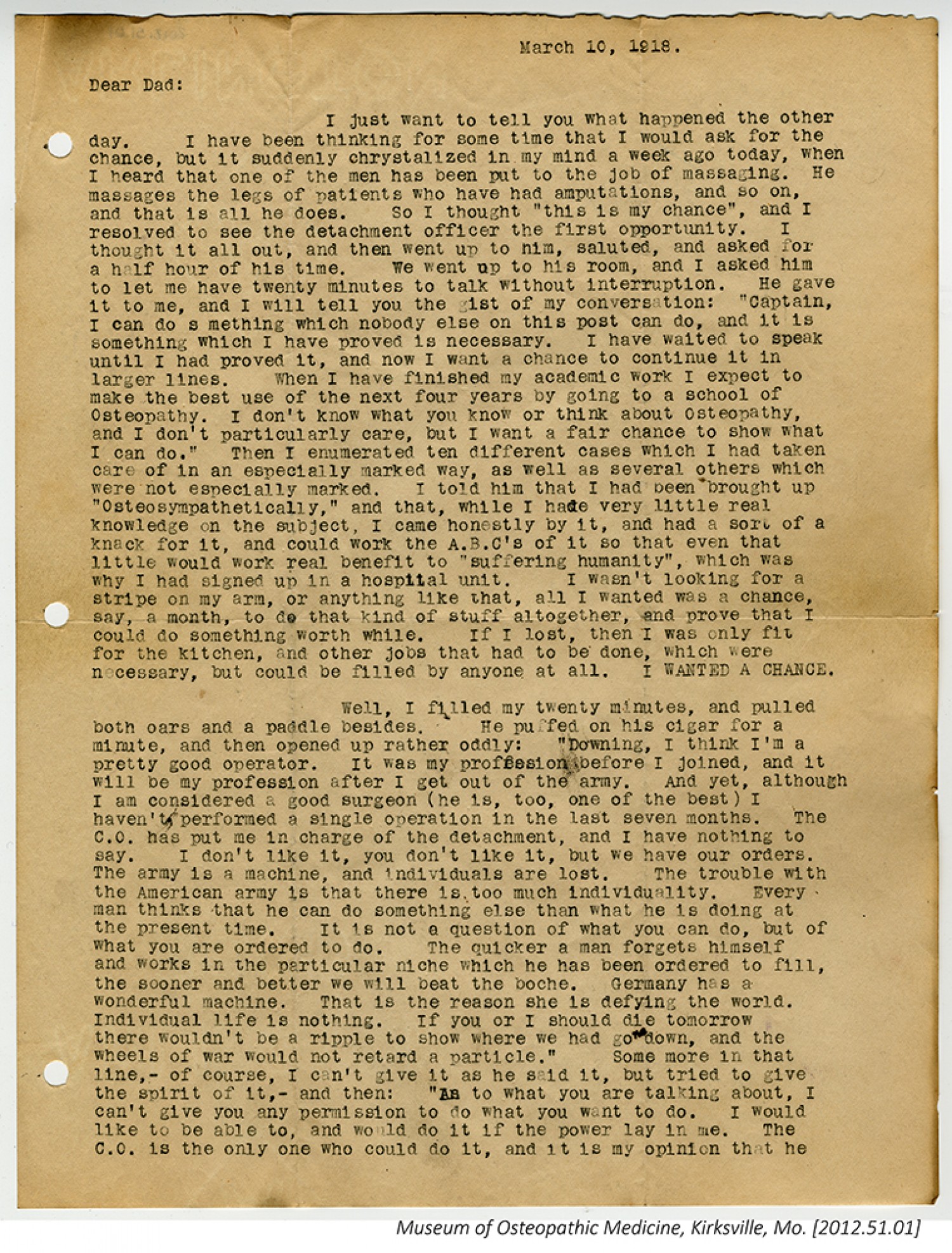 March 10, 1918. Dear Dad: I just want to tell you what happened the other day. I have been thinking for some time that I would ask for the chance, but it suddenly chrystalized in my mind a week ago today, when I heard that one of the men has been put to the job of massaging. He massages the legs of patients who have had amputations, and so on, and that is all he does. So I thought “this is my chance”, and I resolved to see the detachment officer the first opportunity. I thought it all out, and then went up to him, saluted, and asked for a half hour of his time. We went up to his room, and I asked him to let me have twenty minutes to talk without interruption. He gave it to me, and I will tell you the gist of my conversation: “Captain, I can do something which nobody else on this post can do, and it is something which I have proved is necessary. I have waited to speak until I had proved it, and now I want a chance to continue it in larger lines. When I have finished my academic work I expect to make the best use of the next four years by going to a school of Osteopathy, I don’t know what you know or think of Osteopathy, and I don’t particularly care, but I want a fair chance to show what I can do.” Then I enumerated ten different cases which I had taken care of in an especially marked way, as well as several others which were not especially marked. I told him that I had been brought up “Osteosympathetically,” and that, while I hade very little real knowledge on the subject, I came honestly by it, and had a sort of a knack for it, and could work the A.B.C.’s of it so that even that little would work real benefit to “suffering humanity”, which was why I had signed up in a hospital unit. I wasn’t looking for a stripe on my arm, or anything like that, all I wanted was a chance, say, a month, to do that kind of stuff altogether, and prove that I could do something worth while. If I lost, then I was only fit for the kitchen, and other jobs that had to be done, which were necessary, but could be filled by anyone at all. I WANTED A CHANCE. Well, I filled my twenty minutes, and pulled both oars and a paddle besides. He puffed on his cigar for a minute, and then opened up rather oddly: “Downing, I think I’m a pretty good operator. It was my profession before I joined, and it will be my profession after I get out of the army. And yet, although I am considered a good surgeon (he is, too, one of the best) I haven’t performed a single operation in the last seven months. The C.O. has put me in charge of the detachment, and I have nothing to say. I don’t like it, you don’t like it, but we have our orders. The army is a machine, and individuals are lost. The trouble with the American army is that there is too much individuality. Every man thinks that he can do something else than what he is doing at the present time. It is not a question of what you can do, but of what you are ordered to do. The quicker a man forgets himself and works in the particular niche which he has been ordered to fill, the sooner and better we will beat the boche. Germany has a wonderful machine. That is the reason she is defying the world. Individual life is nothing. If you or I should die tomorrow there wouldn’t be a ripple to show where we had gone down, and the wheels of war would not retard a particle.” Some more in that line, - of course, I can’t give it as he said it, but tried to give the spirit of it, - and then: “As to what you are talking about, I can’t give you any permission to do what you want to do. I would like to be able to, and would do it if the power lay in me. The C.O. is the only one who could do it, and it is my opinion that he