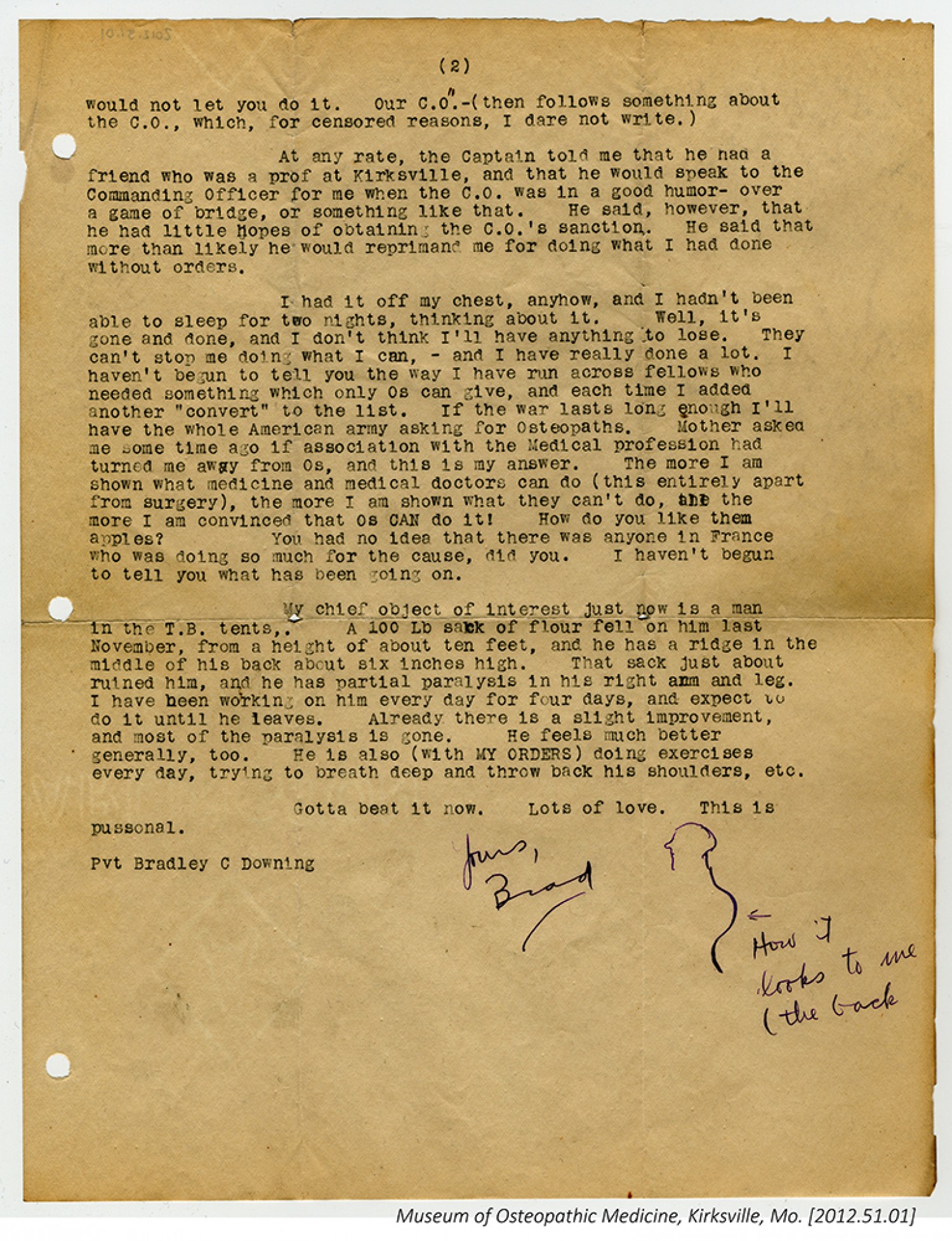 [page 2] would not let you do it. Our C.O. - (then follows something about the C.O., which, for censored reasons, I dare not write.) At any rate, the Captain told me that he had a friend who was a prof at Kirksville, and that he would speak to the Commanding Officer for me when the C.O. was in a good humor - over a game of bridge, or something like that. He said, however, that he had little hopes of obtaining the C.O.’s sanction. He said that more than likely he would reprimand me for doing what I had done without orders. I had it off my chest, anyhow, and I hadn’t been able to sleep for two nights, thinking about it. Well, it’s gone and done, and I don’t think I’ll have anything to lose. They can’t stop me doing what I can, - and I have really done a lot. I haven’t begun to tell you the way I have run across fellows who needed something which only Os can give, and each time I added another “convert” to the list. If the war lasts long enough I’ll have the whole American army asking for Osteopaths. Mother asked me some time ago if association with the Medical profession had turned me away from Os, and this is my answer. The more I am shown what medicine and medical doctors can do (this entirely apart from surgery), the more I am shown what they can’t do, and the more I am convinced that Os CAN do it! How do you like them apples? You had no idea that there was anyone in France who was doing so much for the cause, did you. I haven’t begun to tell you what has been going on. My chief object of interest just now is a man in the T.B. tents,. A 100 Lb sack of flour fell on him last November, from a height of about ten feet, and he has a ridge in the middle of his back about six inches high. That sack just about ruined him, and he has partial paralysis in his right arm and leg. I have been working on him every day for four days, and expect to do it until he leaves. Already there is a slight improvement, and most of the paralysis is gone. He feels much better generally, too. He is also (with MY ORDERS) doing exercises every day, trying to breath deep and throw back his shoulders, etc. Gotta beat it now. Lots of love. This is pussonal. Pvt Bradley C Downing Yours Brad [sketch of injured man] How it looks to me (the back