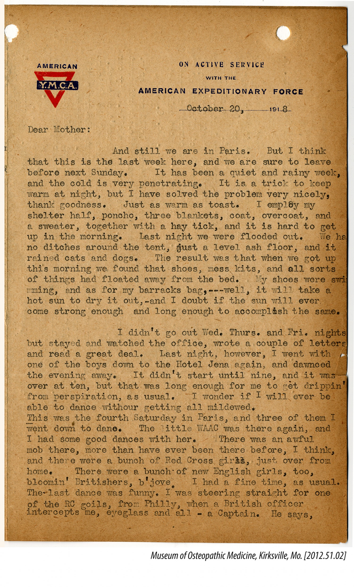 [American Y.M.C.A. letterhead] October 20, 1918 Dear Mother: And still we are in Paris. But I think that this is the last week here, and we are sure to leave before next Sunday. It has been a quiet and rainy week, and the cold is very penetrating. It is a trick to keep warm at night, but I have solved the problem very nicely, thank goodness. Just as warm as toast. I employ my shelter half, poncho, three blankets, coat, overcoat, and a sweater, together with a hay tick, and it is hard to get up in the morning. Last night we were flooded out. We had no ditches around the tent, just a level ash floor, and it rained cats and dogs. The result was that when we got up this morning we found that shoes, mess kits, and all sorts of things had floated away from the bed. My shoes were swimming, and as for my barracks bag, ---well, it will take a hot sun to dry it out, -and I doubt if the sun will ever come strong enough and long enough to accomplish the same. I didn’t go out Wed. Thurs. and Fri. nights but stayed and watched the office, wrote a couple of letters and read a great deal. Last night, however, I went with one of the boys down to the Hotel Jena again, and dawnced the evening away. It didn’t start until nine, and it was over at ten, but that was long enough for me to get drippin’ from perspiration, as usual. I wonder if I will ever be able to dance withour getting all mildewed. This was the fourth Saturday in Paris, and three of them I went down to dane. The little [Women’s Army Auxiliary Corps] was there again, and I had some good dances with her. There was an awful mob there, more than have ever been there before, I think, and there were a bunch of Red Cross girls, just over from home. There were a bunch of new English girls, too, bloomin’ Britishers, b’jove. I had a fine time, as usual. The last dance was funny. I was steering straight for one of the RC goils, from Philly, when a British officer intercepts me, eyeglass and all - a Captain. He says,