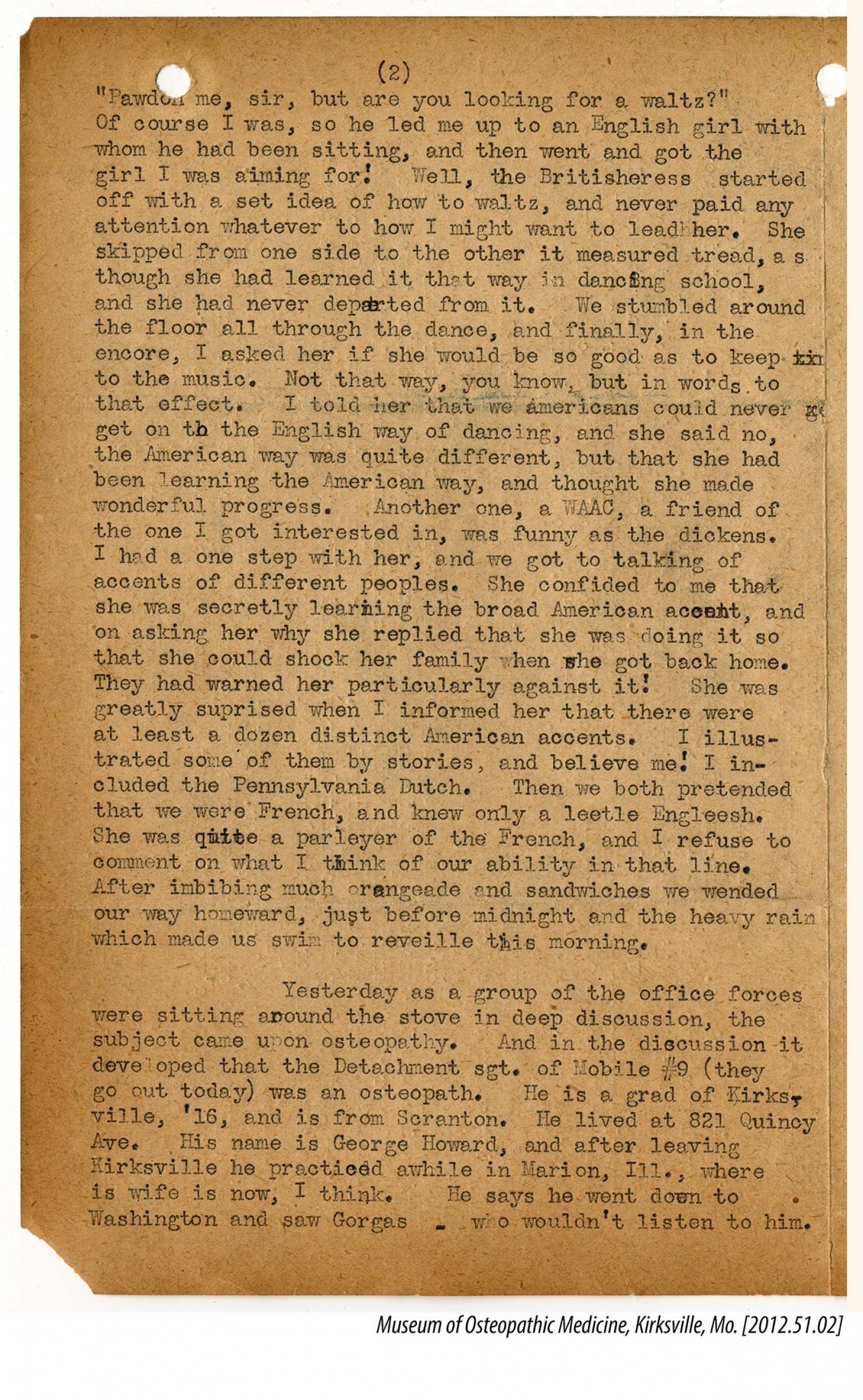[page 2] “Pawdon me, sir, but are you looking for a waltz?” Of course I was, so he led me up to an English girl with whom he had been sitting, and then went and got the girl I was aiming for! Well, the Britisheress started off with a set idea of how to waltz, and never paid any attention whatever to how I might want to lead her. She skipped from one side to the other it measured tread, as though she had learned it that way in dancing school, and she had never departed from it. We stumbled around the floor all through the dance, and finally, in the encore, I asked her if she would be so good as to keep to the music. Not that way, you know, but in words to that effect. I told her that we americans could never get on to the English way of dancing, and she said no, the American way was quite different, but that she had been learning the American way, and thought she made wonderful progress. Another one, a [Women’s Army Auxiliary Corps], a friend of the one I got interested in, was funny as the dickens. I had a one step with her, and we got talking of accents of different peoples. She confided to me that she was secretly learning the broad American accent, and on asking her why she replied that she was doing it so that she could shock her family when she got back home. They had warned her particularly against it! She was greatly surprised when I informed her that there were at least a dozen distinct American accents. I illustrated some of them by stories, and believe me! I included the Pennsylvania Dutch. Then we both pretended that we were French, and knew only a leetle Engleesh. She was quite a parleyer of the French, and I refuse to comment on what I think of our ability in that line. After imbibing much orangeade and sandwiches we wended our way homeward, just before midnight and the heavy rain which made us swim to reveille this morning. Yesterday as a group of the office forces were sitting around the stove in deep discussion, the subject came upon osteopathy. And in the discussion it developed that the Detachment sgt. of Mobile #9 (they go out today) was an osteopath. He is a grad of Kirksville, [1916], and is from Scranton. He lived at 821 Quincy Ave. His name is George Howard, and after leaving Kirksville he practiced awhile in Marion, [Illinois]., where is wife is now, I think. He says he went doen to Washington and saw Gorgas - who wouldn’t listen to him.