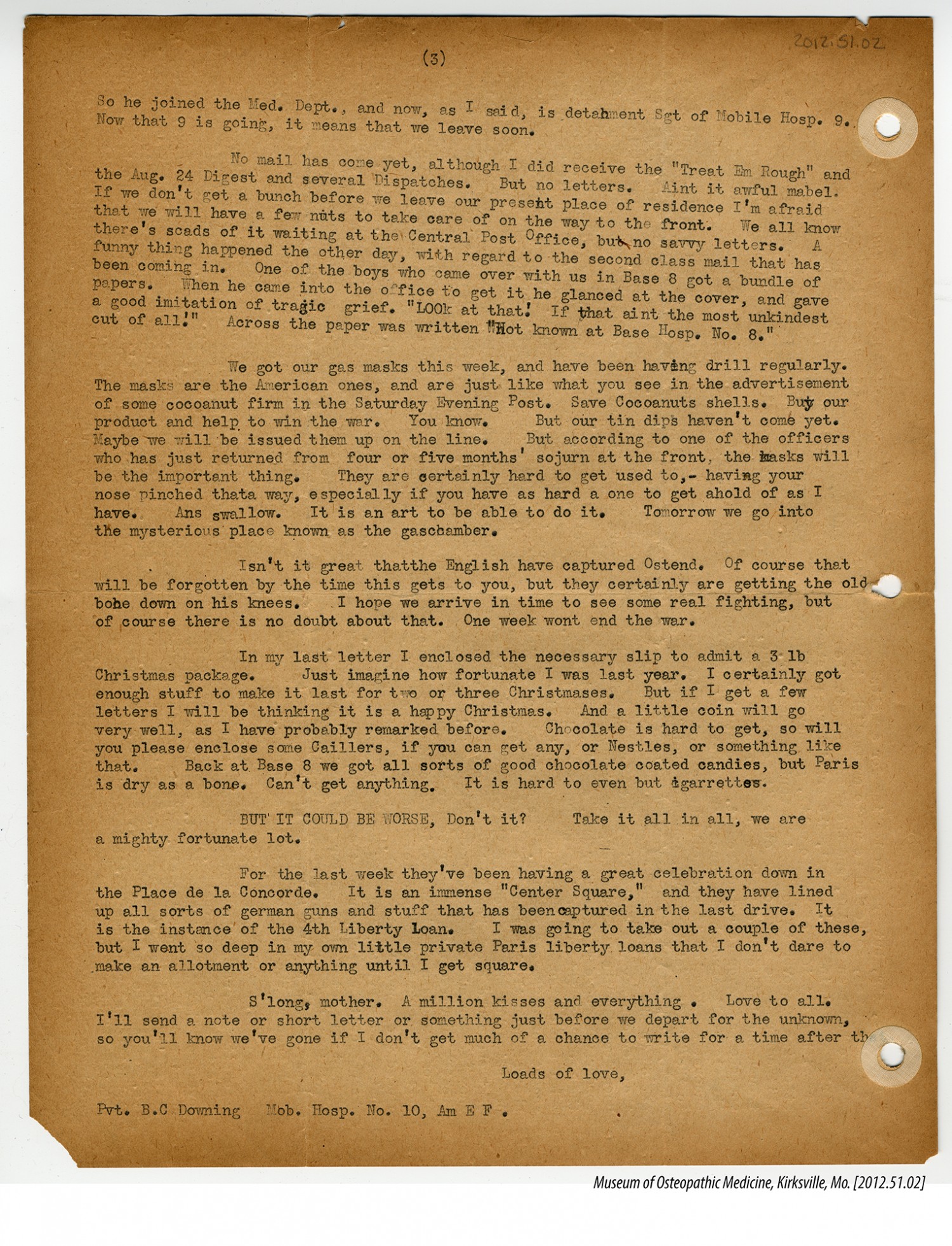 [page 3] So he joined the Med. Dept., and now, as I said, is detacment Sgt of Mobile Hosp. 9. Now that 9 is going, it means that we leave soon. No mail has come yet, although I did received the “Treat Em Rough” and the [August] 24 Digest and several Dispatches. But no letters. Aint it awful mabel. If we don’t get a bunch before we leave our present place of residence I’m afraid that we will have a few nuts to take care of on the way to the front. We all know there’s scads of it waiting at the Central Post Office, but no savvy letters. A funny thing happened the other day, with regard to the second class mail that has been coming in. One of the boys who came over with us in Base 8 got a bundle of papers. When he came into the office to get it he glanced at the cover, and gave a good imitation of tragic grief. “Look at that! If that aint the most unkindest cut of all!” Across the paper was written “Not known at [Base Hospital Number 8]” We got our gas masks this week, and have been having drill regularly. The masks are the American ones, and are just like what you see in the advertisement of some cocoanut firm in the Saturday Evening Post. Save Cocoanuts shells. Buy our product and help to win the war. You know. But our tin dips haven’t come yet. Maybe we will be issued them up on the line. But according to one of the officers who has just returned from four or five months’ sojurn at the front, the masks will be the important thing. They are certainly hard to get used to, - having your nose pinched thata way, especially if you have as hard a one to get ahold of as I have. Ans swallow. It is an art to be able to do it. Tomorrow we go into the mysterious place known as the gaschamber. Isn’t it great that the English have captured Ostend. Of course that will be forgotten by the time this gets to you, but they certainly are getting the old boche down on his knees. I hope we arrive in time to see some real fighting, but of course there is no doubt about that. One week wont end the war. In my last letter I enclosed the necessary slip to admit a 3 lb Christmas package. Just imagine how fortunate I was last year. I certainly got enough stuff to make it last for two or three Christmases. But if I get a few letters I will be thinking it is a happy Christmas. And a little coin will go very well, as I have probably remarked before. Chocolate is hard to get, so will you please enclose some Caillers, if you can get any, or Nestles, or something like that. Back to Base 8 we got all sorts of good chocolate coated candies, but Paris is dry as a bone. Can’t get anything. It is hard to even but cigarrettes. BUT IT COULD BE WORSE, Don’t it? Take it all in all, we are a mighty fortunate lot. For the last week they’ve been having a great celebration down in the Place de la Concorde. It is an immense “Center Square,” and they have lined up all sorts of german guns and stuff that has been captured in the last drive. It is the instance of the 4th Liberty Loan. I was going to take out a couple of these, but I went so deep in my own little private Paris liberty loans that I don’t dare to make an allotment or anything until I get square. S’long, mother. A million kisses and everything. Love to all. I’ll send a note or short letter or something just before we depart for the unknown, so you’ll know we’ve gone if I don’t get much of a chance to write for a time after that Loads of love, Pvt. [Bradley C. Downing] [Mobile Hospital Number 10, American Expeditionary Forces]