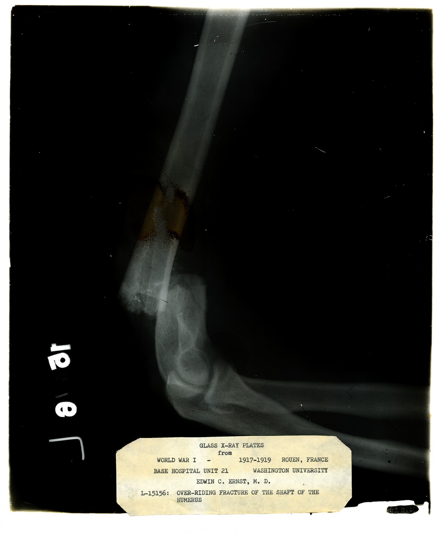 GLASS X-RAY PLATES from WORLD WAR I - 1917-1919 ROUEN, FRANCE BASE HOSPITAL UNIT 21 WASHINGTON UNIVERSITY EDWIN C. ERNST, M. D. L-15156: OVER-RIDING FRACTURE OF THE SHAFT OF THE HUMERUS