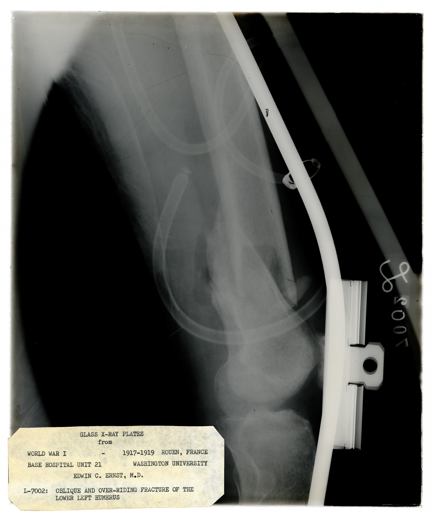 GLASS X-RAY PLATES from WORLD WAR I - 1917-1919 ROUEN, FRANCE BASE HOSPITAL UNIT 21 WASHINGTON UNIVERSITY EDWIN C. ERNST, M. D. L-7002: OBLIQUE AND OVER-RIDING FRACTURE OF THE LOWER LEFT HUMERUS