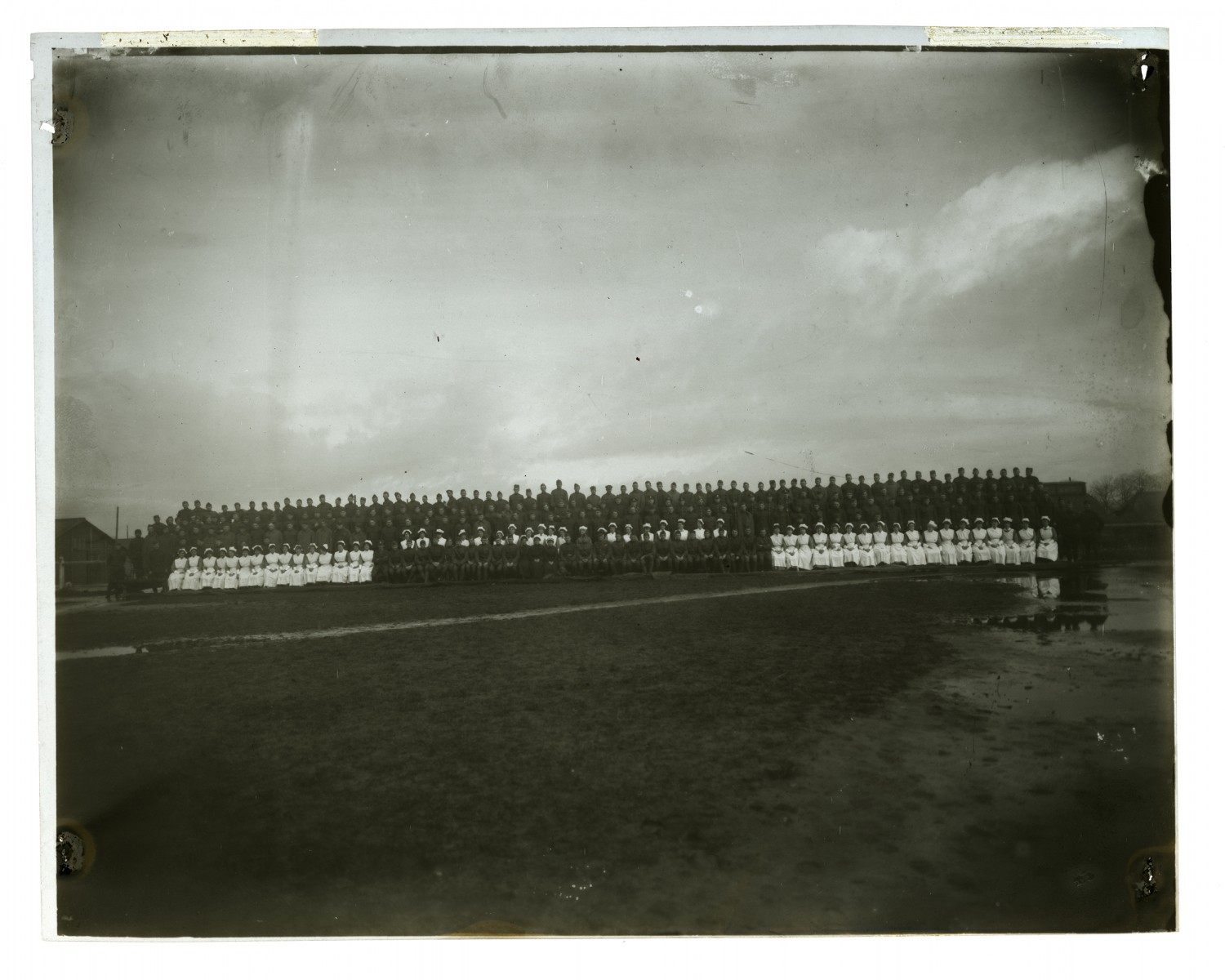 | Description | Unidentified photograph of a large group of nurses and men in uniform. Most likely this photograph is of those working at a base hospital in France. |