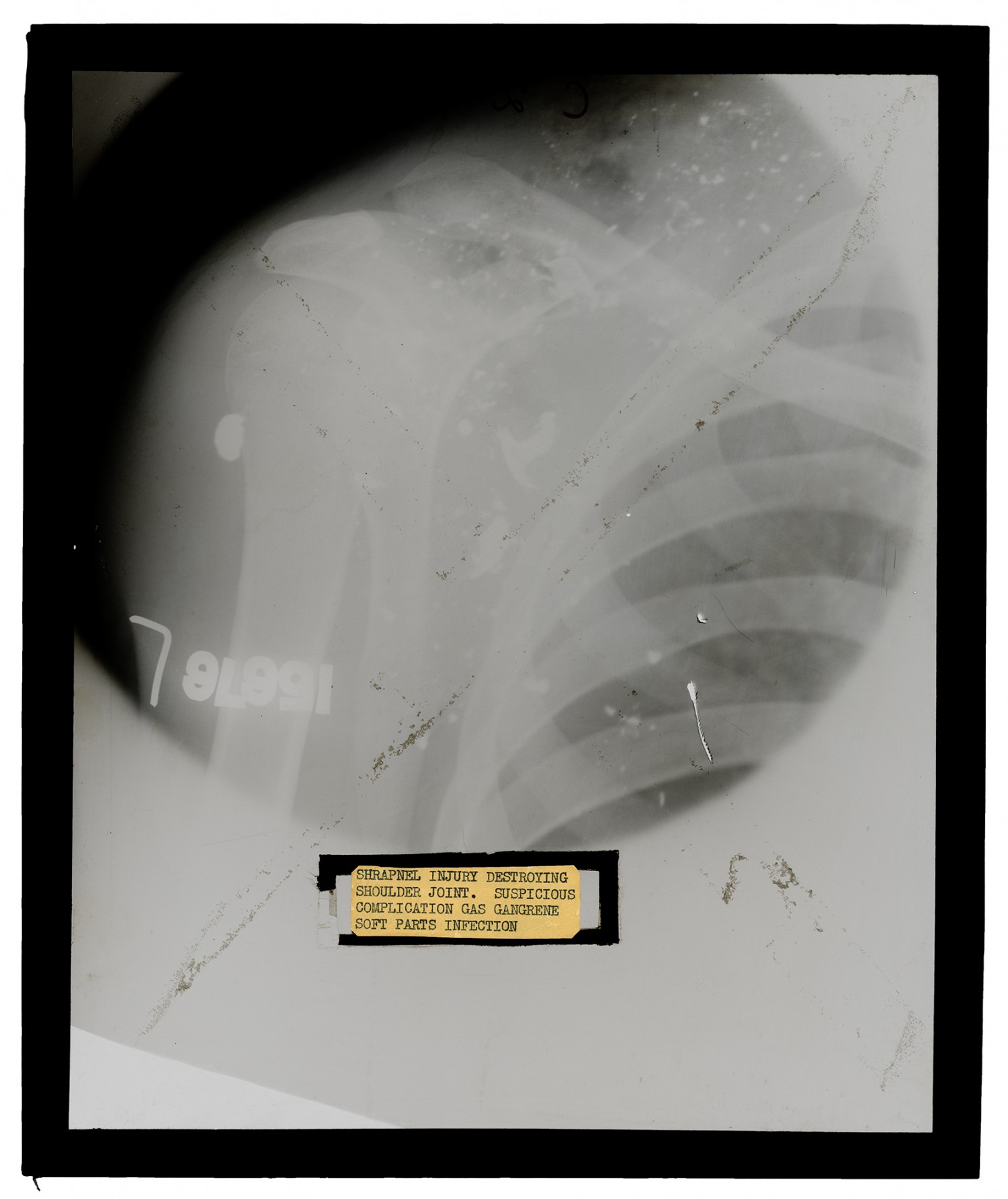 SCHRAPNEL INJURY DESTROYING SHOULDER JOINT. SUSPICIOUS COMPLICATION GAS GANGRENE SOFT PARTS INFECTION