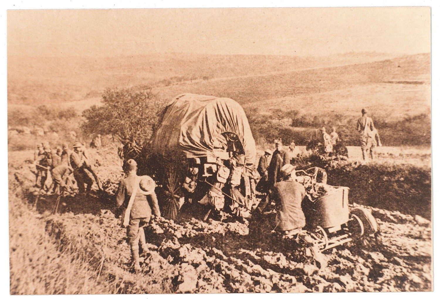 | Description | Photograph of soldiers moving equipment down a road that has been broken up by military traffic |