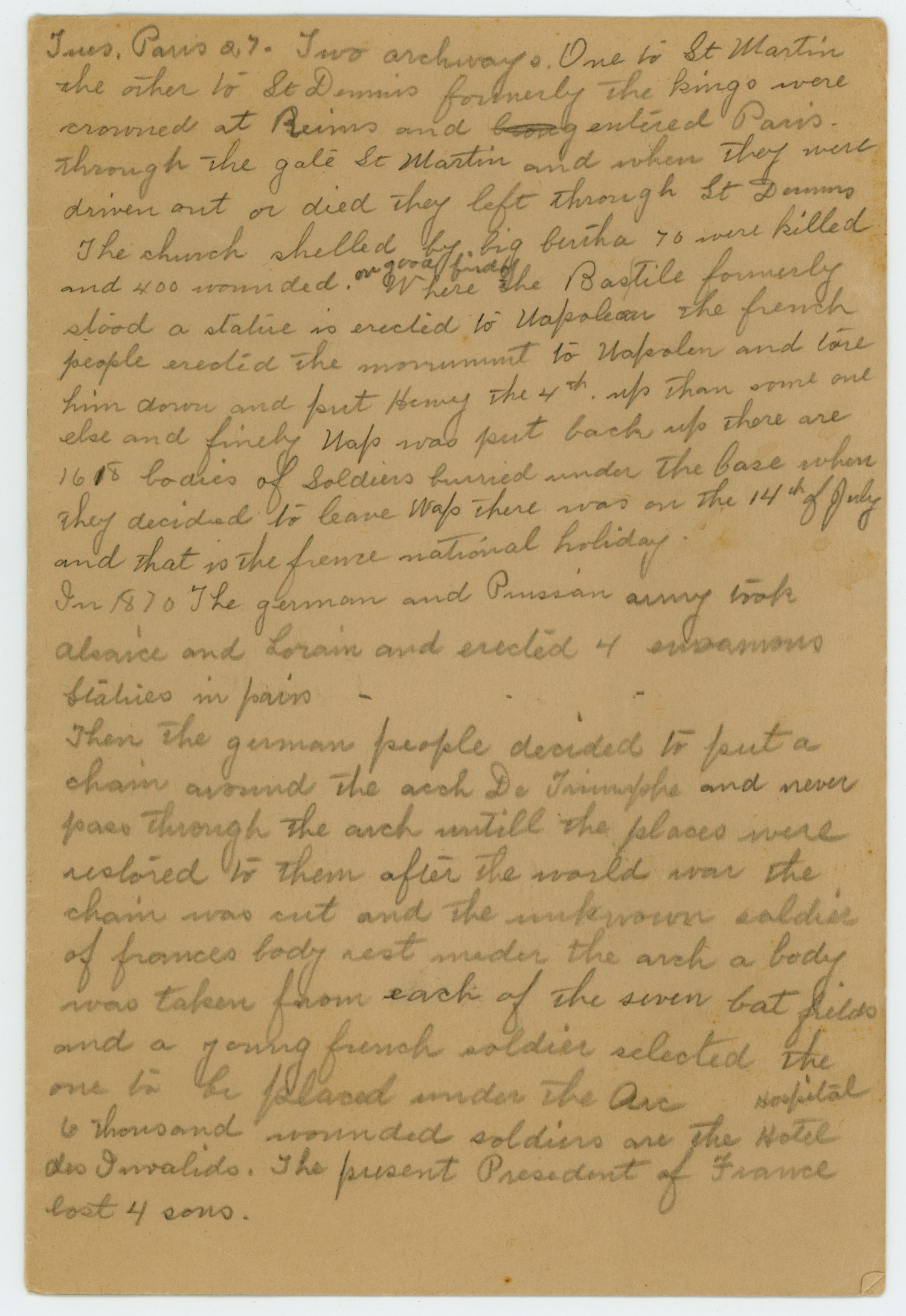 [Tuesday] Paris [ms illegible: 1 wd] Two archways. One is St Martin the other to St Dummis formerly the kings were crowned at Reims and entered Paris through the gate St Martin and when they were driven out or died they left through Lt. Dummis The church shelled by big bertha 70 were killed and 400 wounded on good [ms illegible: 2 wds]. Where the Bastile formerly stood a statue is erected to Napoleon the french people erected the monument to [Napoleon] and tore him down and put Henry the 4th up than some one else and finely [Napoleon] was put back up there are 1618 bodies of Soldiers burned under the base when they decided to leave [ms illegible: 1 wd] there was on the 14th of July and that is the fence national holiday. In 1870 The german and Prussian army took alsaice and Lorain and erected 4 enormous Statues in Paris - Then the german people decided to put a chain around the arch De Triumphs and never pass through the arch untill the places were restored to them after the world war the chain was cut and the unknown soldier of frances body rest under the arch a body was taken from each of the seven bat fields and a young french soldier selected the one to be placed under the Arc 6 thousand wounded soldiers are the Hotel des Invalids. The present President of France lost 4 sons.