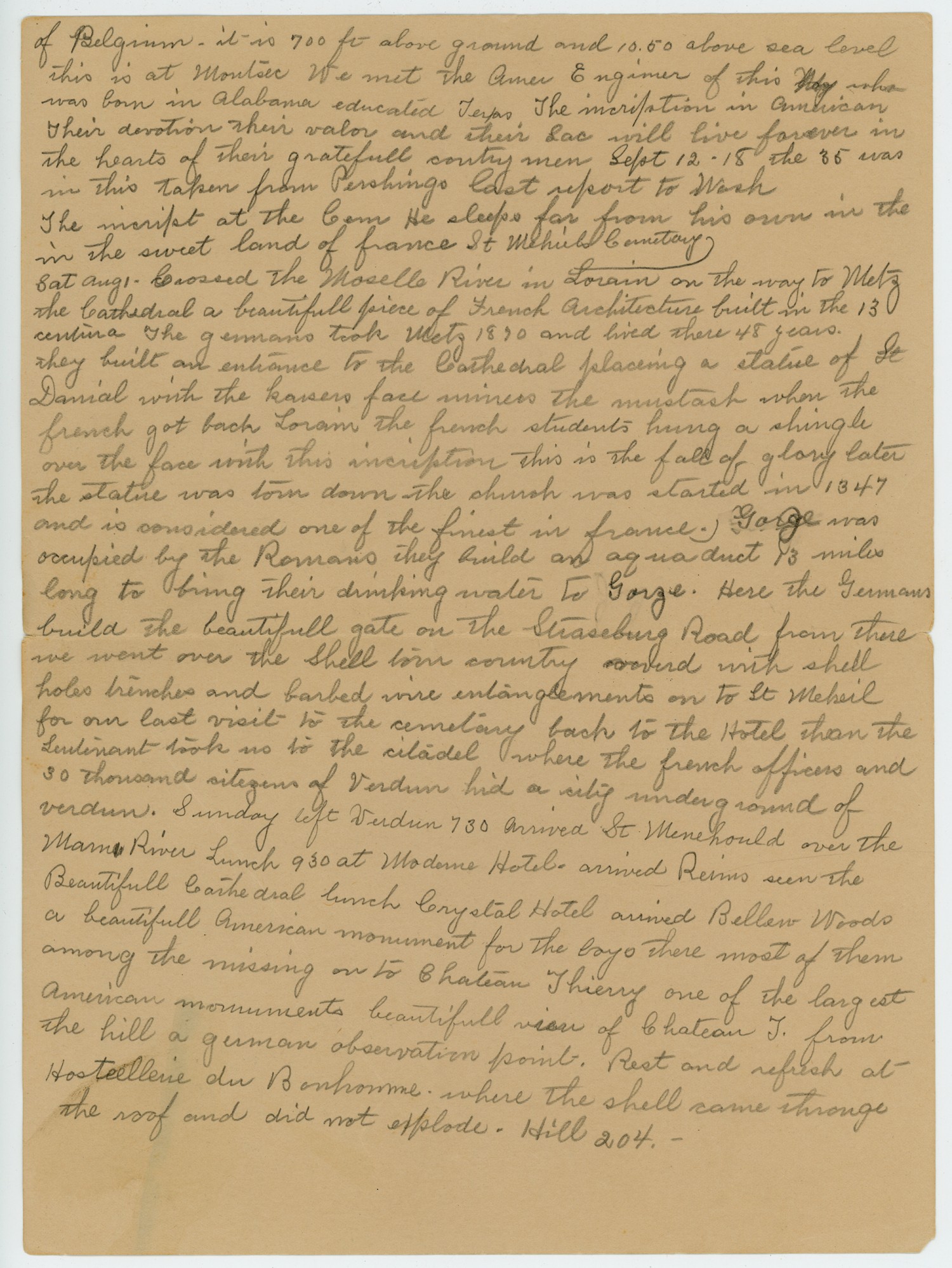 of Belgium - it is 700 ft above ground and 10.50 above sea level this is at Montsec We met the Amer Engineer of this who was born in Alabama educated Texas The incription in American Their devotion their valor and their Sac will live forever in the hearts of their gratfull country men [September 12, 1918] the 35 was in this taken from Pershings last report to Wash The incript at the Cem He sleeps far from his own in the sweet land of france St Mihiels Cemitary [Saturday] [August] 1 - Crossed the Moselle River in Lorain on the way to Metz the Cathedral a beautifull piece of French Architecture built in the 13 centura The germans took Metz 1890 and lived there 48 years. They built an entrance to the Cathedral placeing a statue of St Denial with the Kaisers face minus the mustash when the french got back Lorain the french students hung a shingle over the face with this inscription this is the fall of glory later the statue was torn down the church was started in 1347 and is considered one of the finest in france. Gorge was occupied by the Romans they build an aquaduct 13 miles long to bring their drinking water to Gorge. Here the Germans build the beautifull gate on the Straseburg Road from there we went over the Shell torn country coverd with shell holes trenches and barbed wire entanglements on to St Mihiel for our last visit to the cemetary back to the Hotel than the Leutenant took us to the citadel where the french officers and 30 thousand citizens of Verdun hid a city underground of Verdun. Sunday left Verdun 730 Arrived St Minehould over the Marne River Lunch 930 at Moderne Hotel arrived Reims seen the Beautifull Cathedral lunch Crystal Hotel arrived [Belleau Woods] a beautifull American monument for the boys there most of them among the missing beautifull view of Chateau T. from the hill a german observation point. Rest and refresh at Hostelleire du Bonhomme where the shell come through the roof and did not explode - Hill 204. -