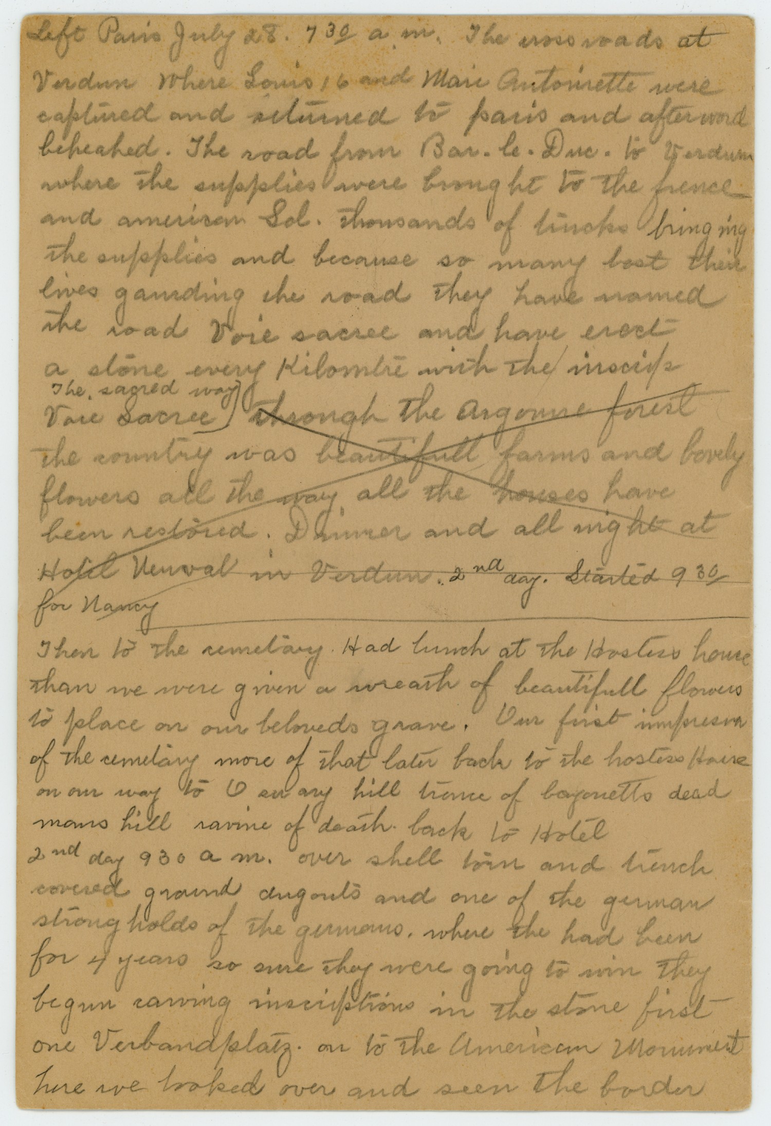 Left Paris July 28. 730 a.m. The crossroads at Verdun where Louis 16 and Mare Antoinette were captured and returned to paris and afterword beheaded. The road from Bar-le-Duc- to Verdun where the supplied were brought to the fence and american Sol. thousands of trucks bringing the supplies and because so many lost their lives gaurding the road they have named the road Voi sacre and have erect a stone every Kilomtre with the inscrip Vaie Sacrce The sacred way [ms crossed out] Then to the cemetary. Had lunch at the Hostess house than we were given a wreath of beautifull flowers to place on our beloveds grave. Our first impress of the cemetary more of that later back to the hostess House on our way to [ms illegible: 1 wd] hill trance of bayonetts dead mans hill ravine of death back to Hotel 2nd day 930 am. over shell torn and trench covered ground dugouts and one of the german strongholds of the germans, where the had been for 4 years so sure they were going to win they begun carving inscriptions in the stone first on Verdanplatz on to the American Monument here we looked over and seen the border