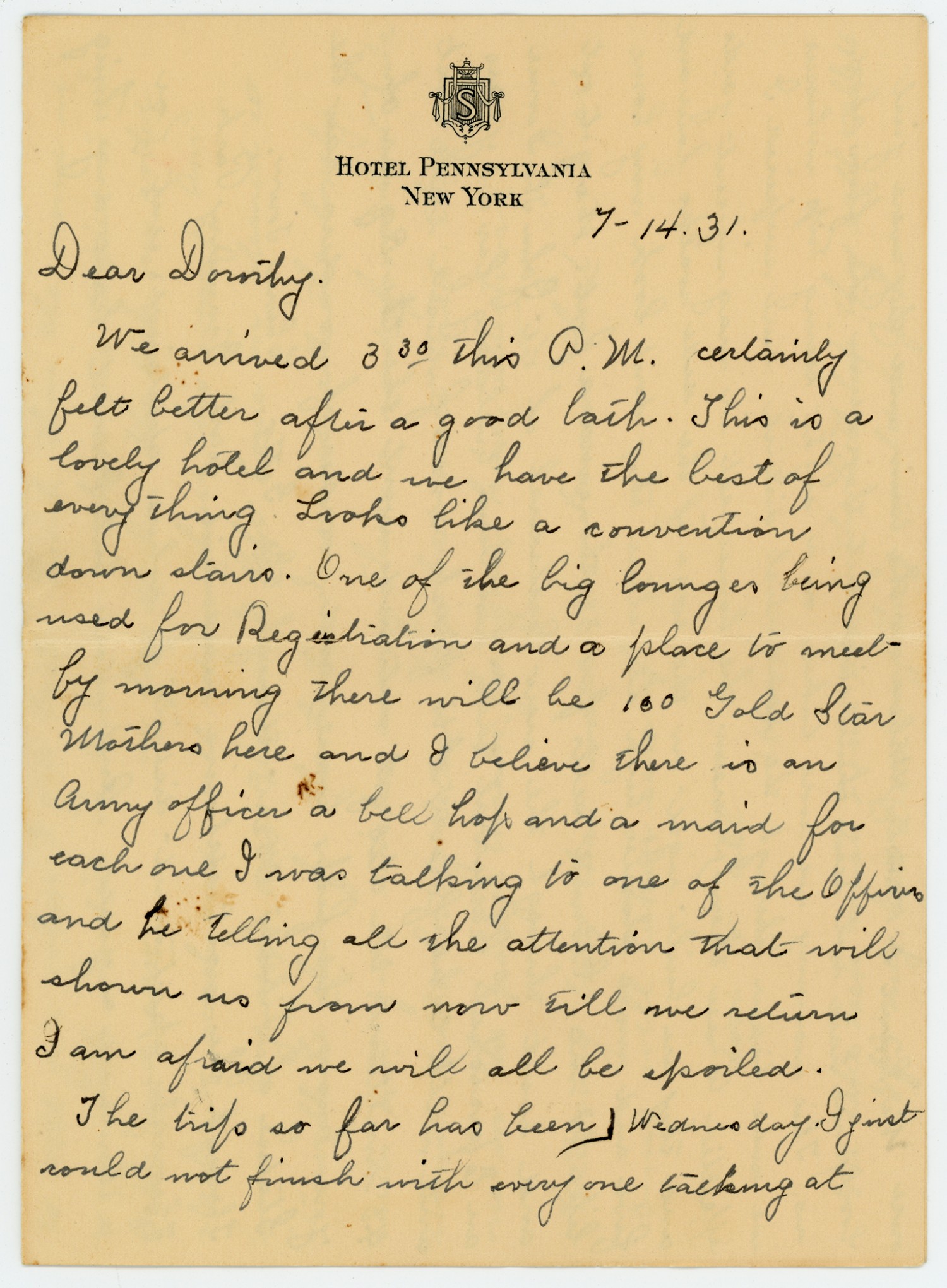 [7-14-1931] Dear Dorothy. We arrived 330 this P.M. certainly felt better after a good bath. This is a lovely hotel and we have the best of everything. Looks like a convention down stairs. One of the big lounges being used for Registration and a place to meet by morning there will be 100 Gold Star Mothers here and I believe there is an Army officer a bell hop and a maid for each one I was talking to one of the Officers and he telling all the attention that will shown us from now till we return I am afraid we will all be spoiled. The trip so far has been] Wednesday I just could not finish with every one talking at