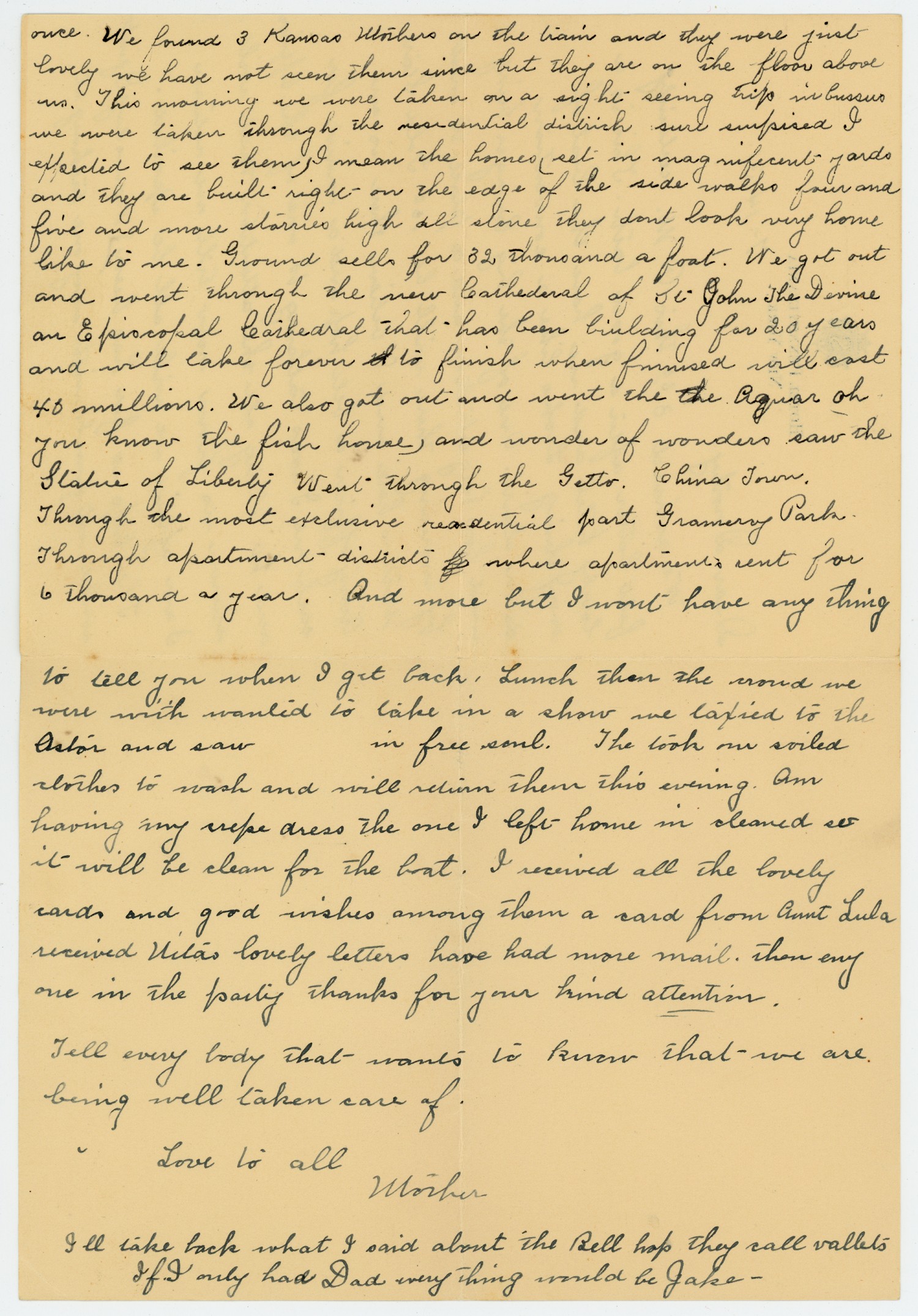 once. We found 3 Kansas Mothers on the train and they were just lovely we have not seen them since but they are on the floor above us. This morning we were taken on a sight seeing trip in busses we were taken through the residential district sure surprised I expected to see them, I mean the homes, set in magnifecent yards and they are built right on the edge of the side walks four and five and more storries high all stone they dont look very home like to me. Ground sells for 32 thousand a foot. We got out and went through the new Cathedral of St John The Devine an Episcopal Cathedral that has been building for 20 years and will take forever to finish when finished it will cost 40 millions. We also got out and went the Aguar oh you know the fish house, and wonder of wonders saw the Statue of Liberty Went through the Getto. China Town. Through the most exclusive residential part Gramery Park Through apartment districts where apartments rent for 6 thousand a year. And more but I wont have any thing to tell you when I get back. Lunch then the crowd we were with wanted to take in a show we taxied to the Ostor and saw in free soul. The took our soiled clothes to wash and will return them this evening. Am having my crepe dress the one I left home in cleaned so it will be clean for the boat. I received all the lovely cards and good wishes among them a card from Aunt Lula received Nitas lovely letters have had more mail then any one in the party thanks for your kind attention. Tell every body that wants to know that we are being well taken care of. Love to all Mother Ill take back what I said about the Bell hop they call vallets If I only had Dad everything would be Jake -