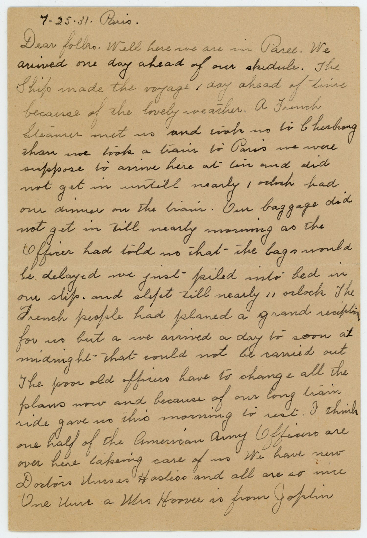 [7/25/1931] Paris. Dear folks. Well here we are in Paree. We arrived one day ahead of our skedule. The Ship made the voyage, day ahead of time because of the lovely weather. A French Steamer met us and took us to Cherbrang than we took a train to Paris we were suppose to arrive here at ten and did not get in untill nearly 1 oclock had our dinner on the train. Our luggage did not get in till nearly morning as the Officer had told us that the bags would be delayed we just piled into bed in our ship. and slept till nearly 11 oclock The French people had planed a grand reception for us but a we arrived a day to soon at midnight that could not be carried out The poor old officers have to change all the plans now and because of our long train ride gave no this morning to rest. I think one half of the American Army Officers are over here takeing care of us We have new Doctors Nurses Hostess and all are so nice One [ms illegible: 1 wd] a Mrs Hoover is from Joplin