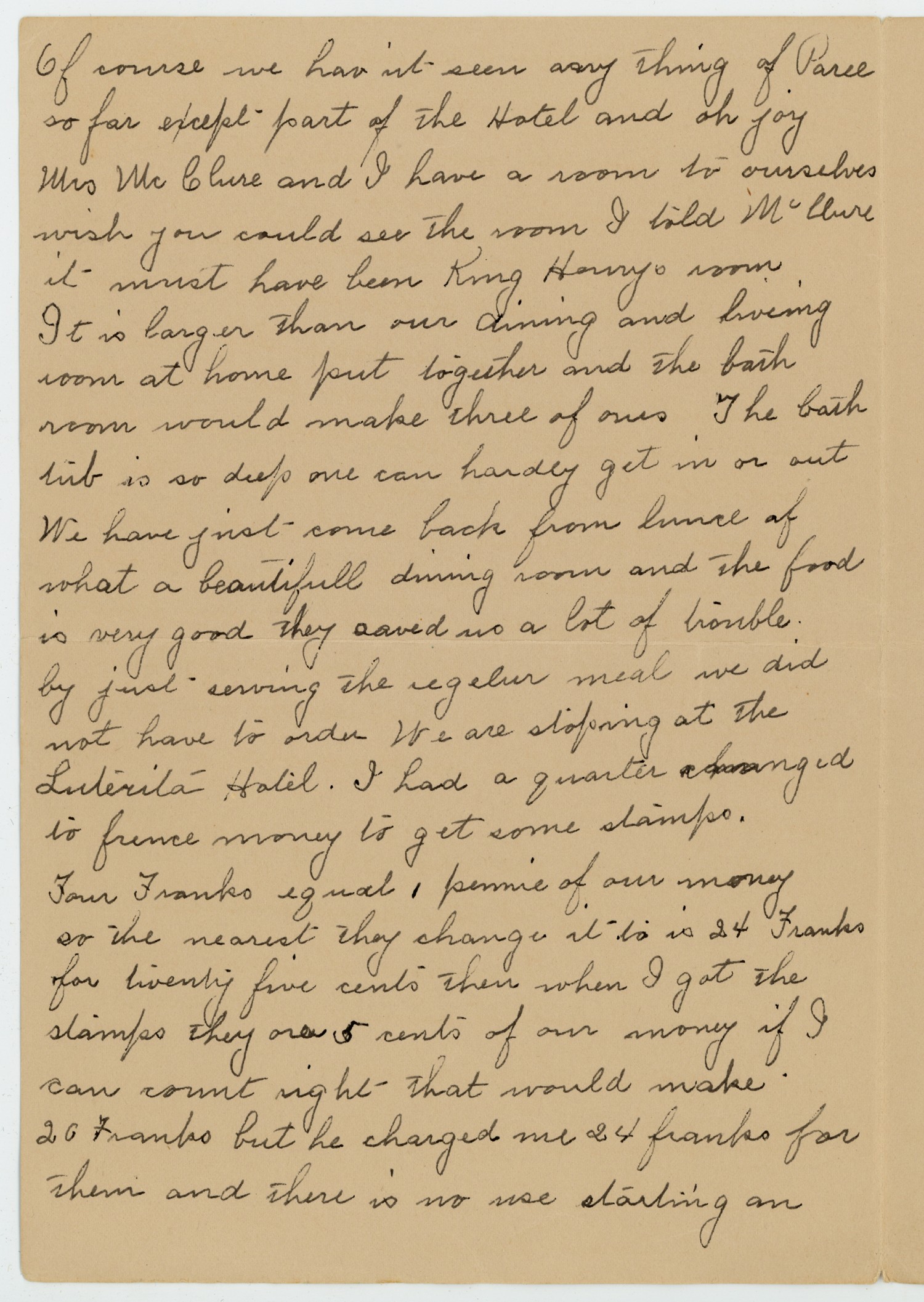 Of course we havnt seen any thing of Paree so far except part of the Hotel and oh joy Mrs McClure and I have a room to ourselves wish you could see the room I told McClure it must have been King Henrys room. It is larger than our dinning and living room at home put together and the bath room would make three of ours The bath tub is so deep one can hardly get in or out We have just come back from lunch of what a beautifull dinning room and the food is very good they saved us a lot of trouble by just serving the regular meal we did not have to order We are stoping at the [ms illegible: 1 wd] Hotel. I had a quarter changed to frence money to get some stamps. Four Franks equal, pennie of our money so the nearest they change it to is 24 Franks for twenty five cents their when I got the stamps they are 5 cents of our money if I can count right that would make 20 Franks but he charged me 24 franks for them and there is no use starting an