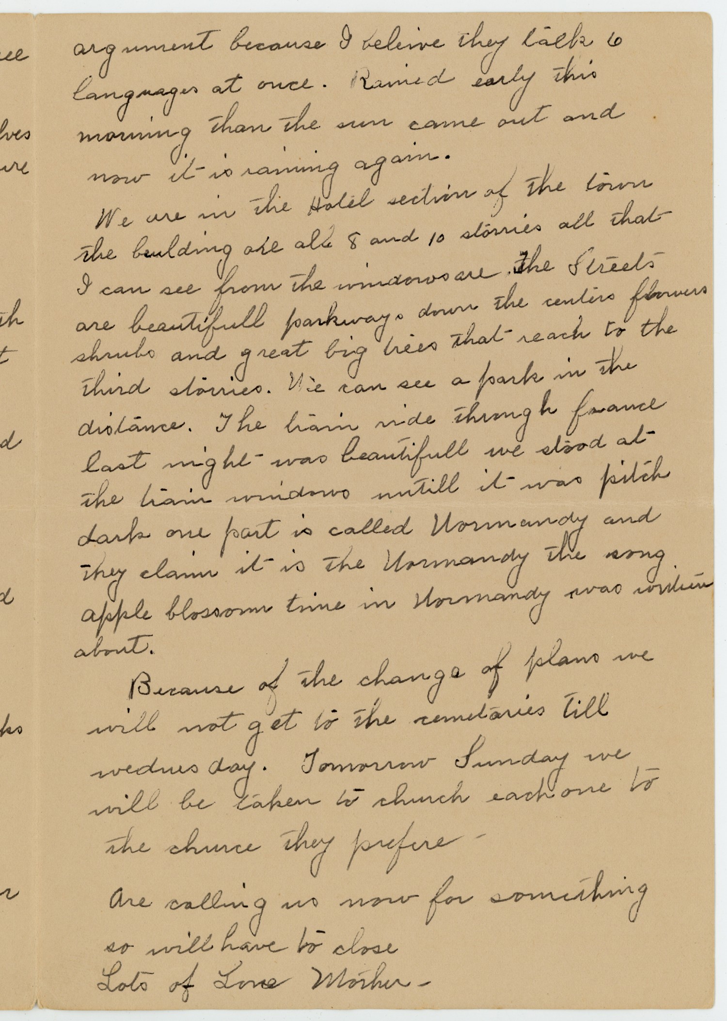 argument because I believe they talk 6 languages at once. Rained early this morning than the sun came out and now it is raining again. We are in the Hotel section of the town the building are able 8 and 10 storries all that I can see from the windows are The Streets are beautifull parkways down the centers flowers shrubs and great big trees that reach to the third storries. We can see a park in the distance. The train ride through france last night was beautifull we stood at the train window untill it was pitch dark one part is called Normandy and they claim it is the Normandy the song apple blossom time in Normandy was [ms illegible: 1 wd] about. Because of the change of plans we will not get to the cemetaries till wednesday. Tomorrow Sunday we will be taken to church each one to the churce they prefer - Are calling us now for something so will have to close Lots of Love Mother -