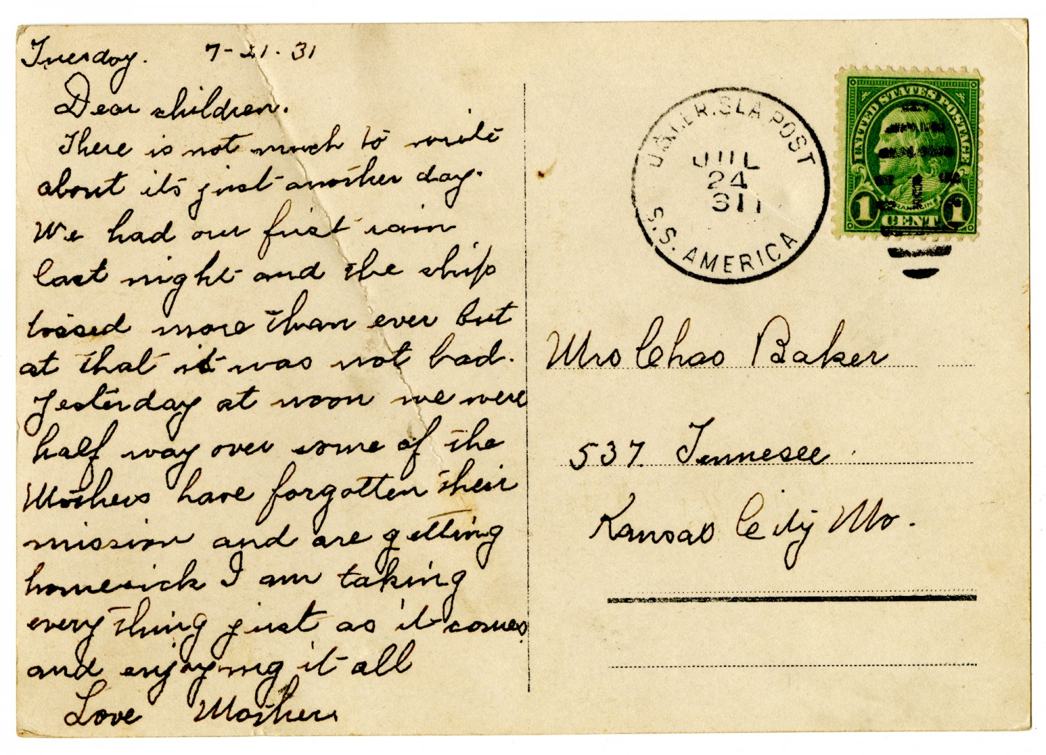 Tuesday. [July 21, 1931] Dear children, There is not much to write about its just another day. We had our first rain last night and the ship tossed more than ever But at that it was not bad. Yesterday at noon we were half way over some of the Mothers have forgotten their mission and are getting homesick I am taking everything just as it comes and enjoying it all Love Mother Mrs [Charles] Baker 537 Tennessee Kansas City [Missouri]