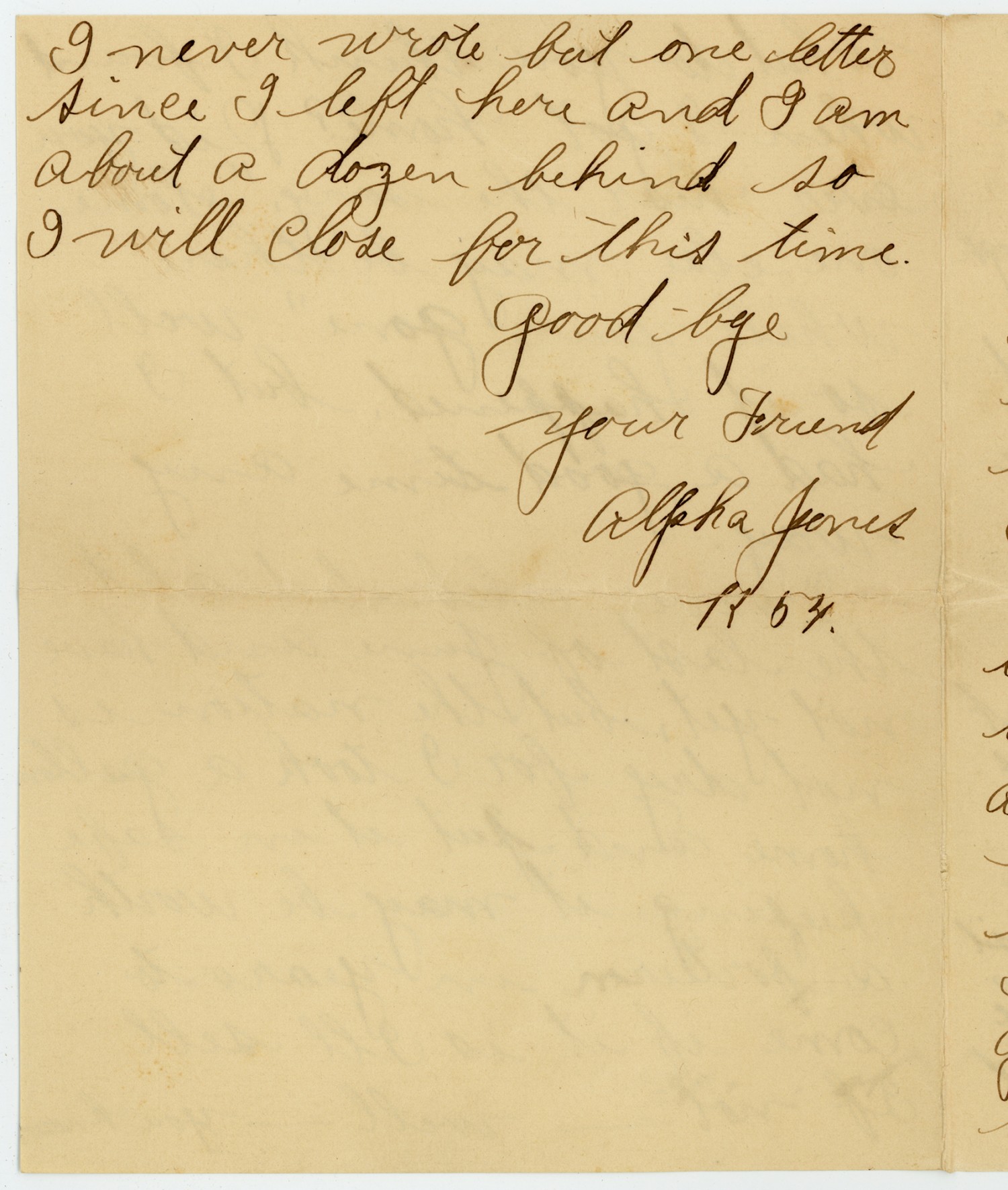 I never wrote but one letter since I left here and I am about a dozen behind so I will close for this time. good bye your Friend Alpha Jones K 54.