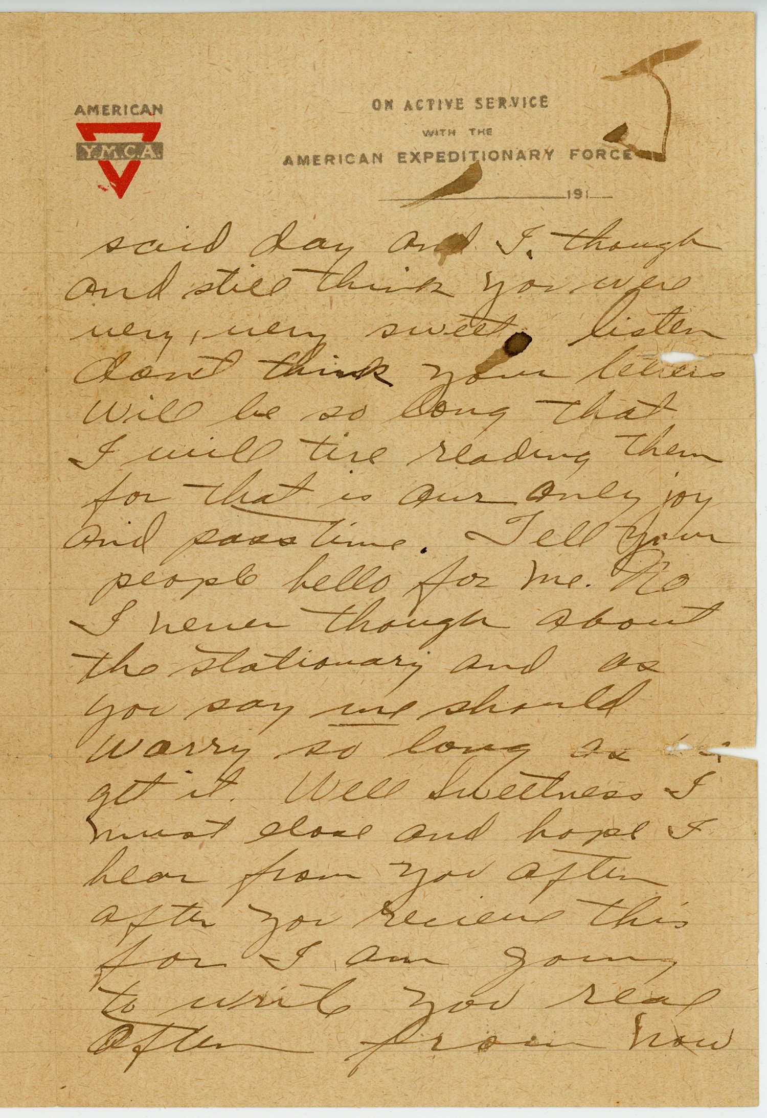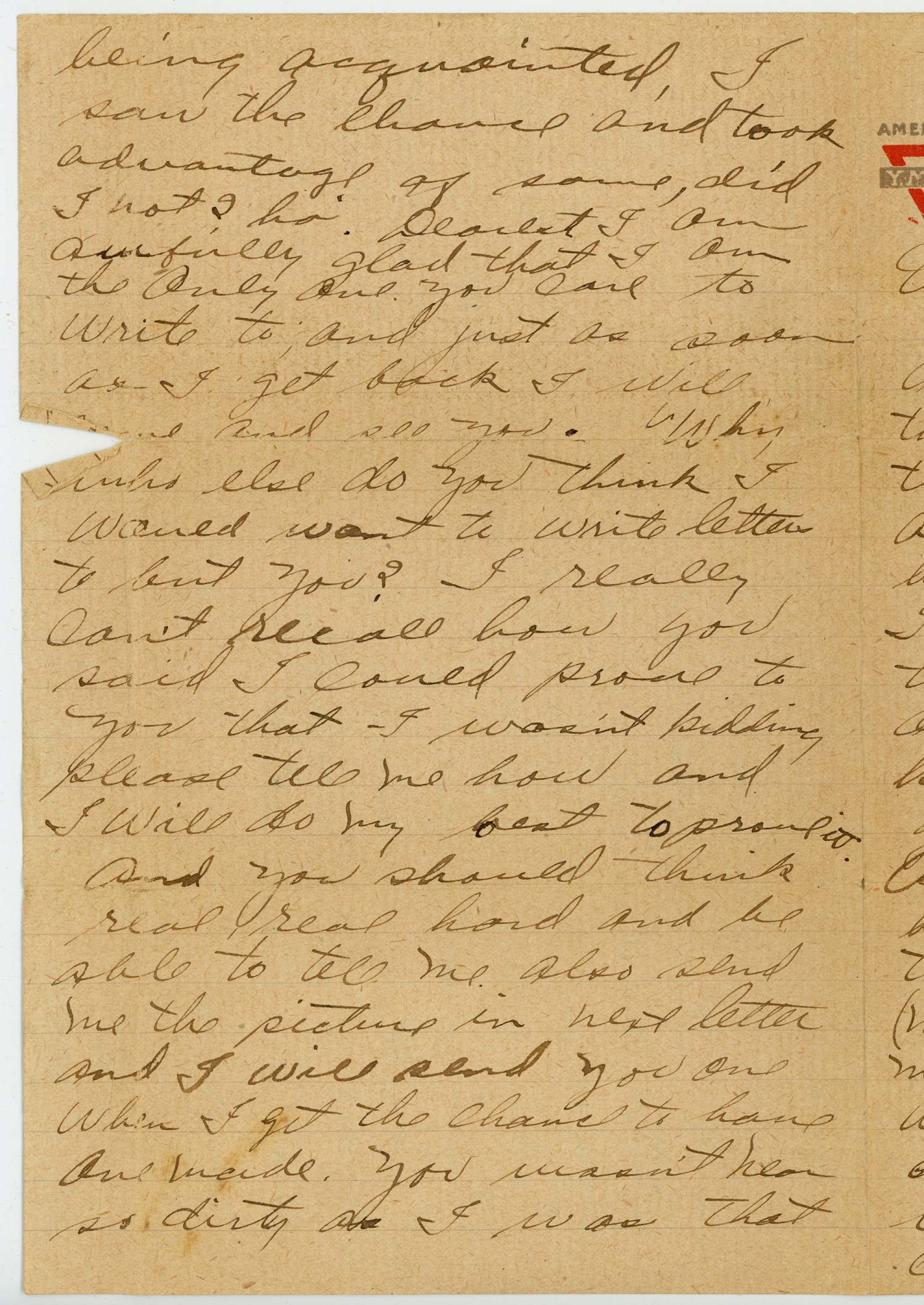being acquainted, I saw the chance and took advantage of some, did I not? ha! Dearest I am awfully glad that I am the only one you care to write to, and just as soon as I get back I will [ms torn: 1 wd] and see you. Why who else do you think I would want to write letters to but you? I really can