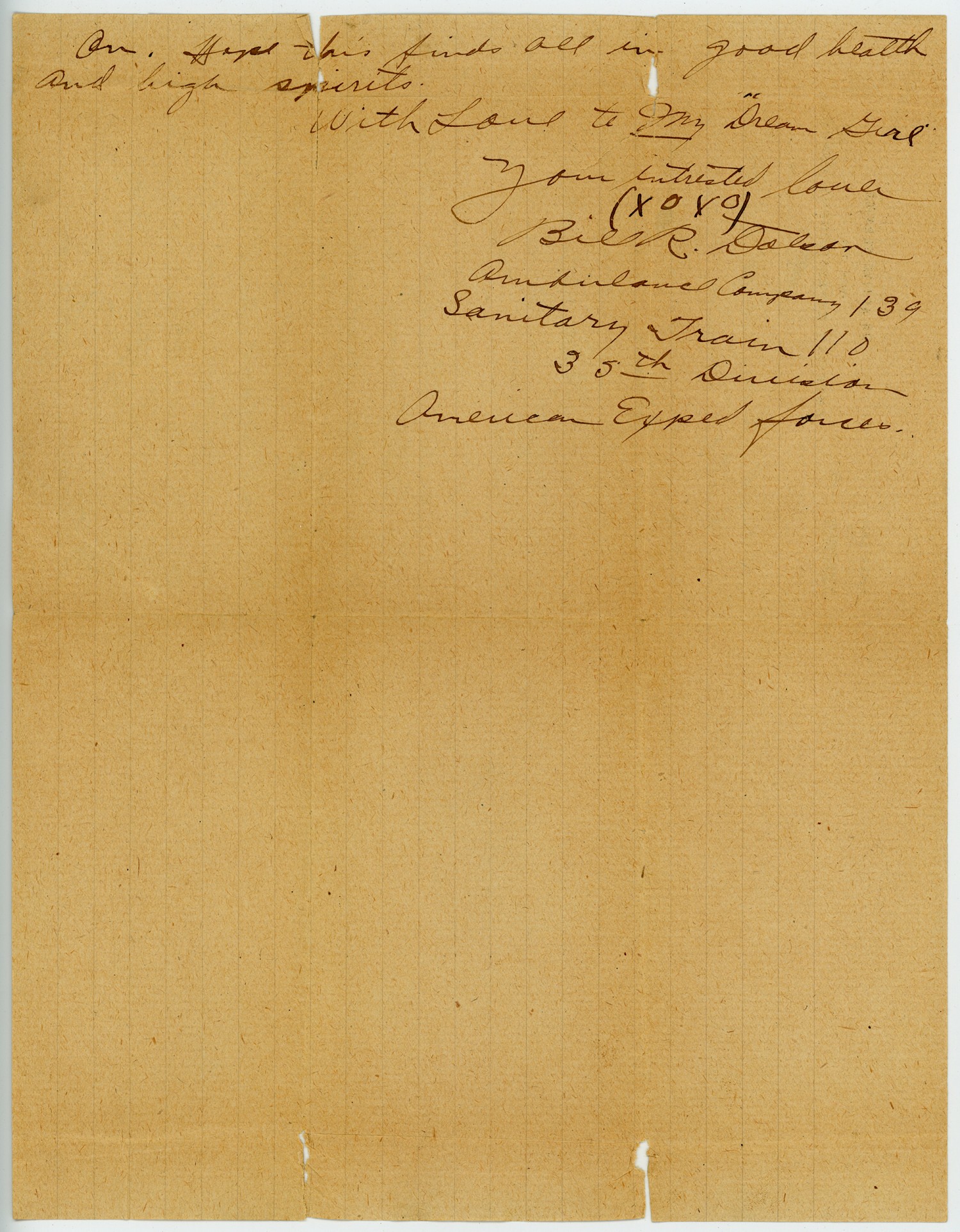 | Description | Bill R. Dotson sent this letter to Agnita Fraas on August 29, 1918. Dotson discussed various news from home. Dotson served in France as part of the 139th Ambulance Company, 110th Sanitation Train. |